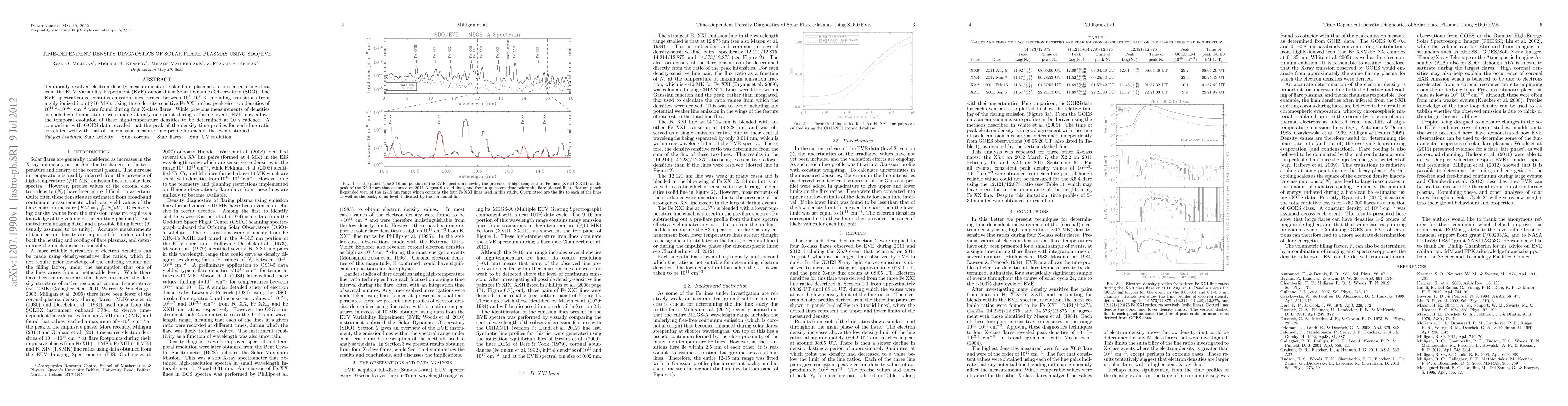 This study uses SDO/EVE data to measure temporally-resolved electron densities in solar flares, finding peak densities of 10^(11.2)-10^(12.1) cm^(-3) during four X-class flares. The EVE instrument enables the first temporal evolution of high-temperature densities to be tracked at 10 s intervals.