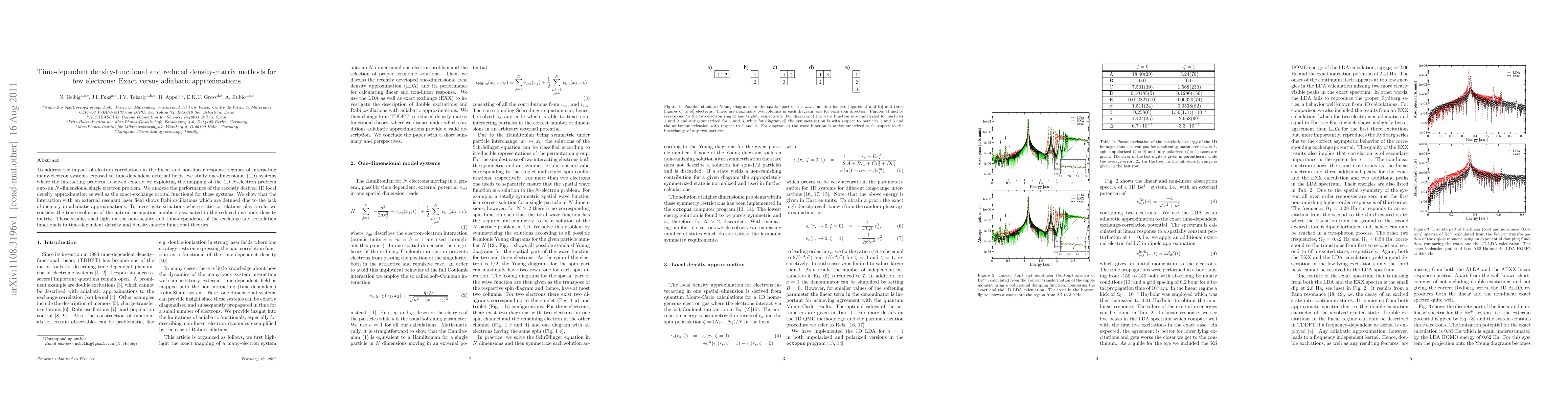 To address the impact of electron correlations in the linear and non-linear response regimes of interacting many-electron systems exposed to time-dependent external fields, we study one-dimensional (1D) systems where the interacting problem is solved exactly by exploiting the mapping of the 1D $N$-electron problem onto an $N$-dimensional single electron problem. We analyze the performance of the recently derived 1D local density approximation as well as the exact-exchange orbital functional for those systems. We show that the interaction with an external resonant laser field shows Rabi oscillations which are detuned due to the lack of memory in adiabatic approximations. To investigate situations where static correlations play a role, we consider the time-evolution of the natural occupation numbers associated to the reduced one-body density matrix. Those studies shed light on the non-locality and time-dependence of the exchange and correlation functionals in time-dependent density and density-matrix functional theories.