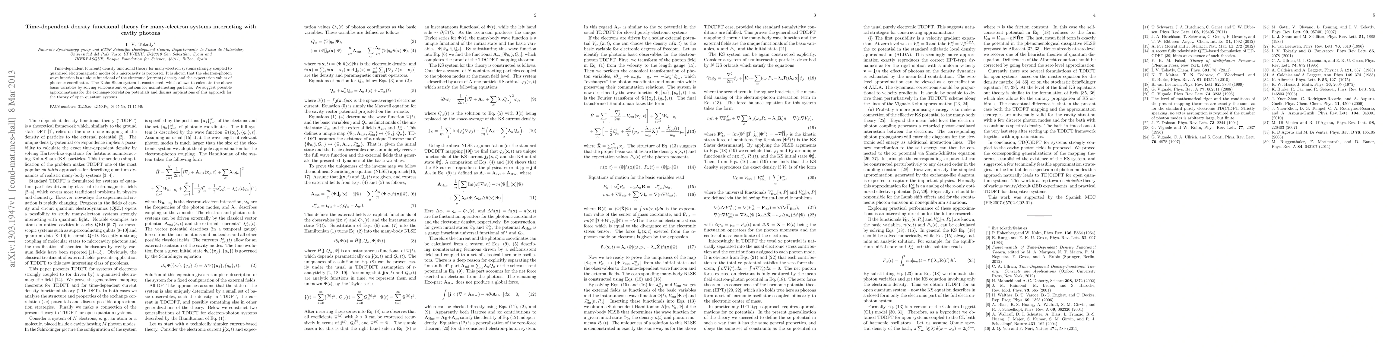 This paper proposes a time-dependent density functional theory for many-electron systems interacting with cavity photons, demonstrating that the electron-photon wave function depends on the electronic density and photonic coordinates. The Kohn-Sham system is constructed to solve self-consistent equations for noninteracting particles, suggesting approximations for exchange-correlation potentials and discussing implications for open quantum systems.