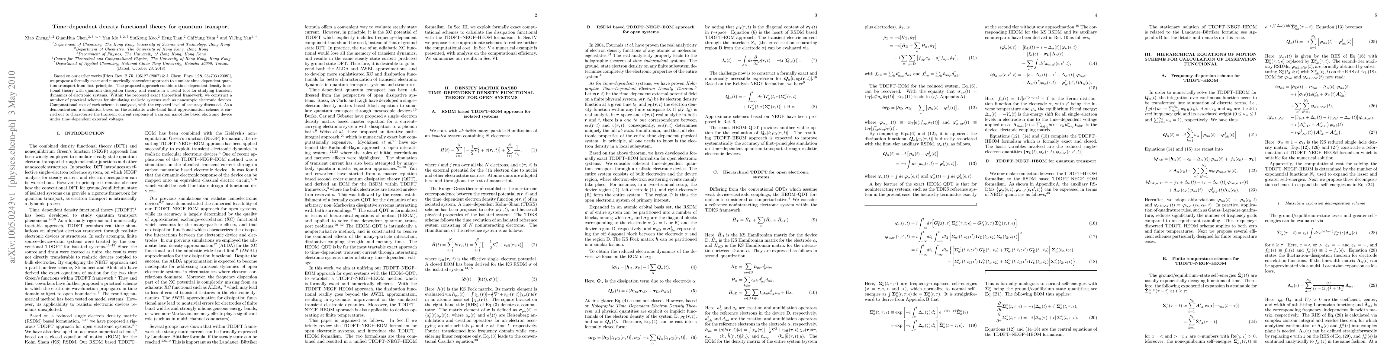 This paper proposes a new approach combining time-dependent density functional theory with quantum dissipation theory to simulate quantum transport from first-principles. It offers practical schemes for studying transient dynamics in electronic systems, demonstrating its application to a carbon nanotube device under time-varying voltages.