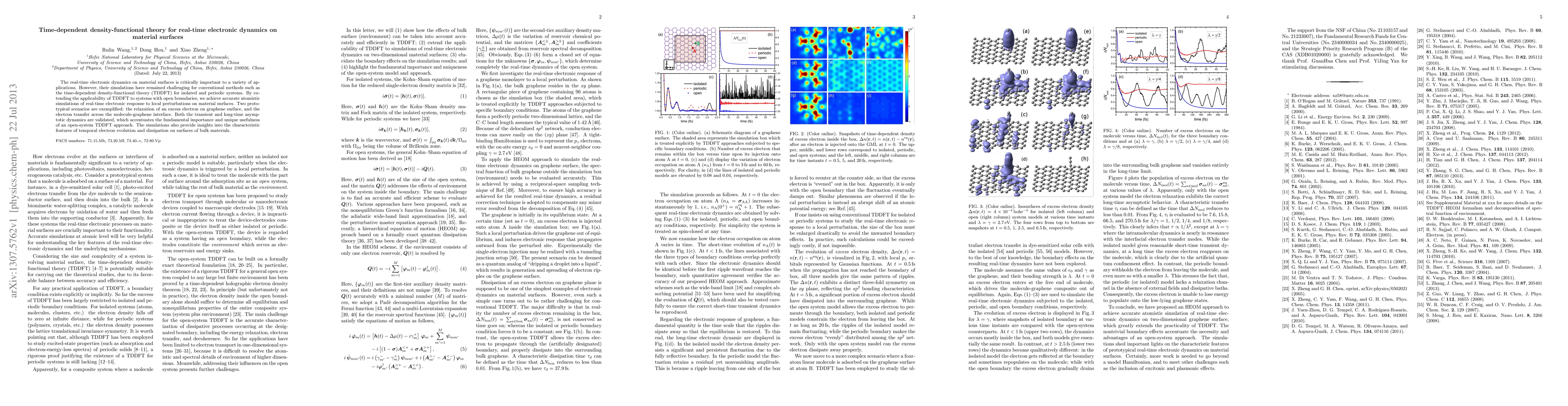 This paper extends time-dependent density-functional theory (TDDFT) to simulate real-time electronic dynamics on material surfaces, achieving accurate atomistic simulations of local perturbations. The method is validated through examples of electron relaxation on graphene and electron transfer across a molecule-graphene interface, highlighting the unique insights provided by open-system TDDFT.