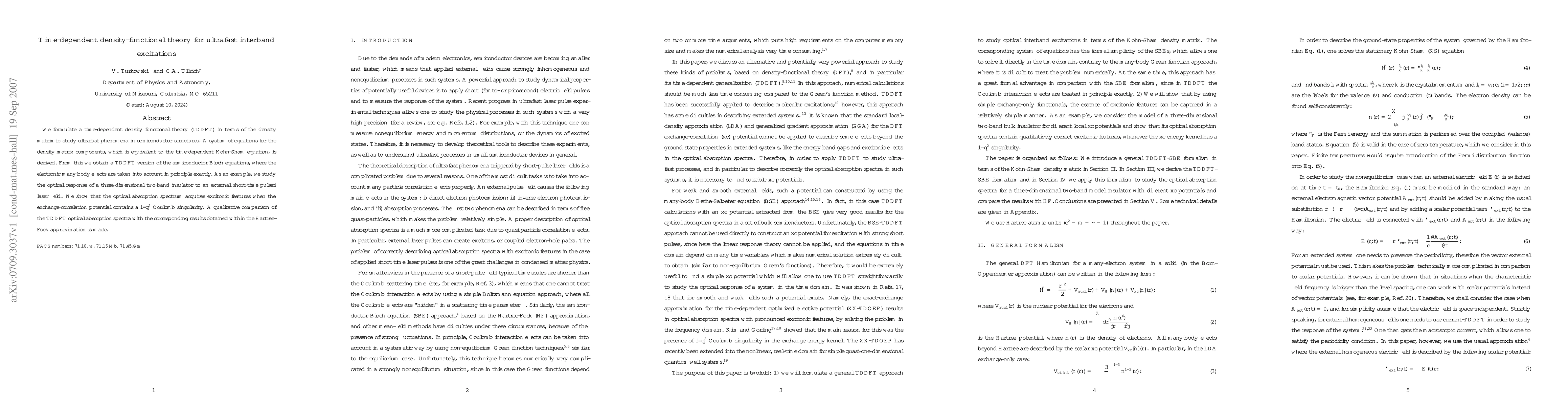 This paper formulates a time-dependent density functional theory (TDDFT) for ultrafast interband excitations in semiconductors, deriving a system of equations for the density matrix and a TDDFT version of the semiconductor Bloch equations. The study shows that the optical absorption spectrum exhibits excitonic features when the exchange-correlation potential includes a $1/q^{2}$ Coulomb singularity, and compares these results with those from the Hartree-Fock approximation.