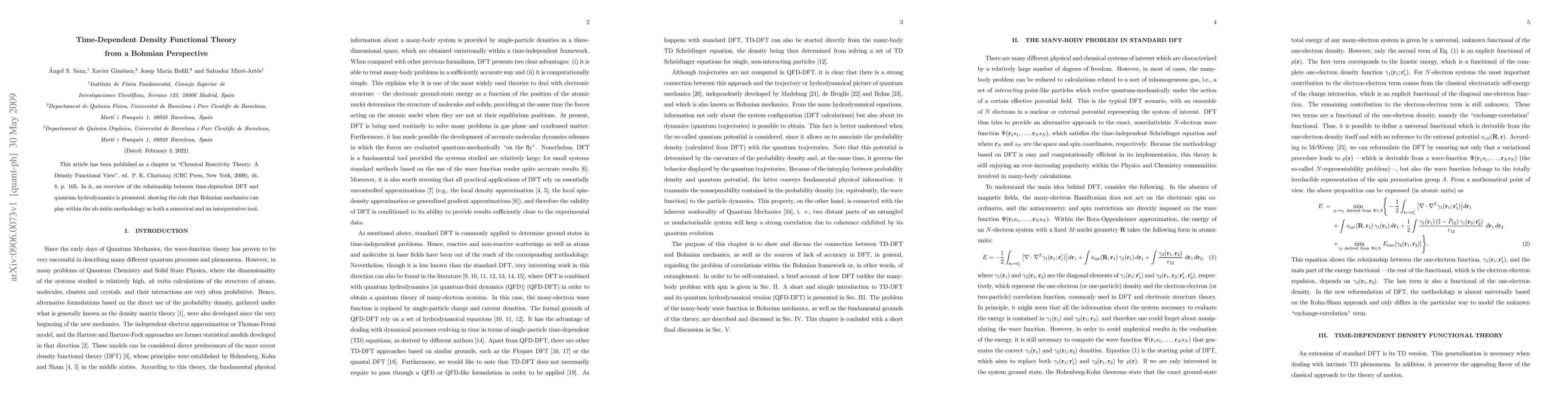 This article has been published as a chapter in "Chemical Reactivity Theory: A Density Functional View", ed. P. K. Chattaraj (CRC Press, New York, 2009), ch. 8, p. 105. In it, an overview of the relationship between time-dependent DFT and quantum hydrodynamics is presented, showing the role that Bohmian mechanics can play within the ab-initio methodology as both a numerical and an interpretative tool.