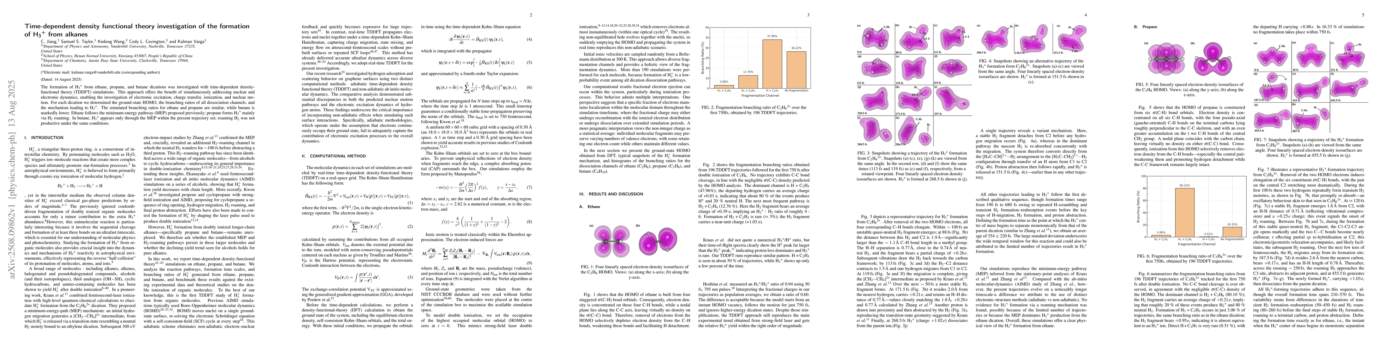 The formation of H$^{3+}$ from ethane, propane, and butane dications was investigated with time-dependent density-functional theory (TDDFT) simulations. This approach offers the benefit of simultaneously addressing nuclear and electronic dynamics, enabling the investigation of electronic excitation, charge transfer, ionization, and nuclear motion. For each dication we determined the ground-state HOMO, the branching ratios of all dissociation channels, and the mechanism leading to H$^{3+}$. The simulated branching ratios for ethane and propane are similar, while butane is markedly lower. Ethane follows the minimum-energy pathway (MEP) proposed previously; propane forms H$^{3+}$ mainly via H$_2$ roaming. In butane, H$^{3+}$ appears only through the MEP within the present trajectory set; roaming H$_2$ was not observed under the same conditions.