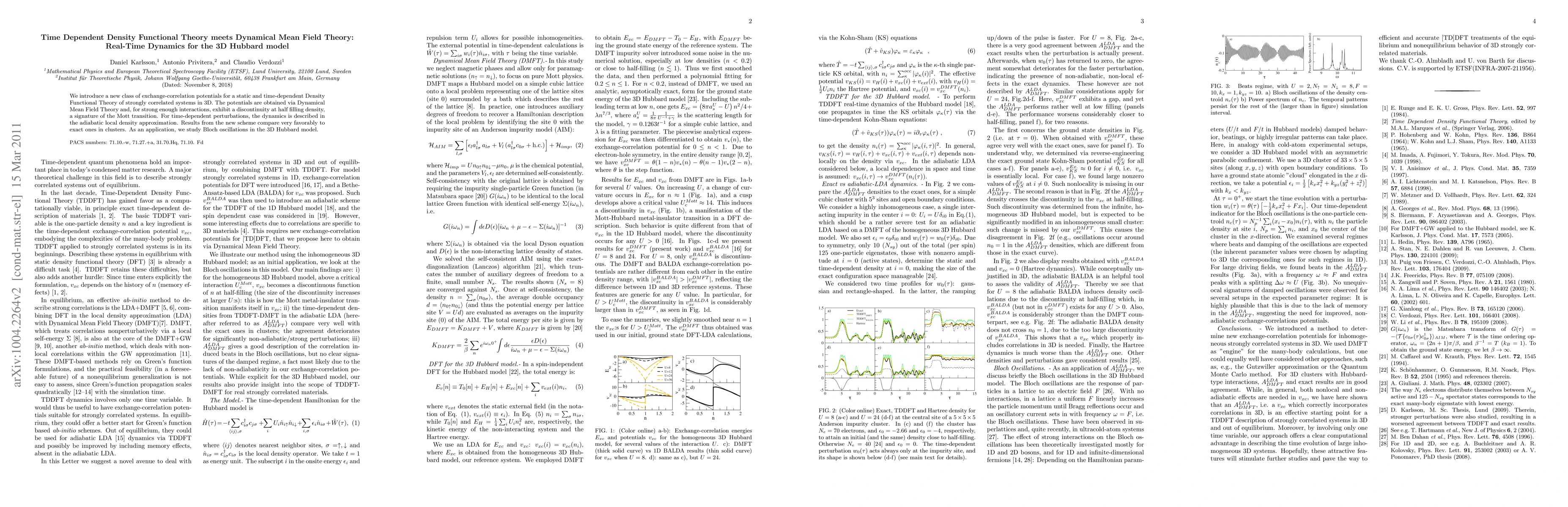 This paper introduces novel exchange-correlation potentials for time-dependent Density Functional Theory derived from Dynamical Mean Field Theory, showing a discontinuity indicative of the Mott transition. The new scheme effectively describes Bloch oscillations in the 3D Hubbard model, comparing favorably to exact results in clusters.