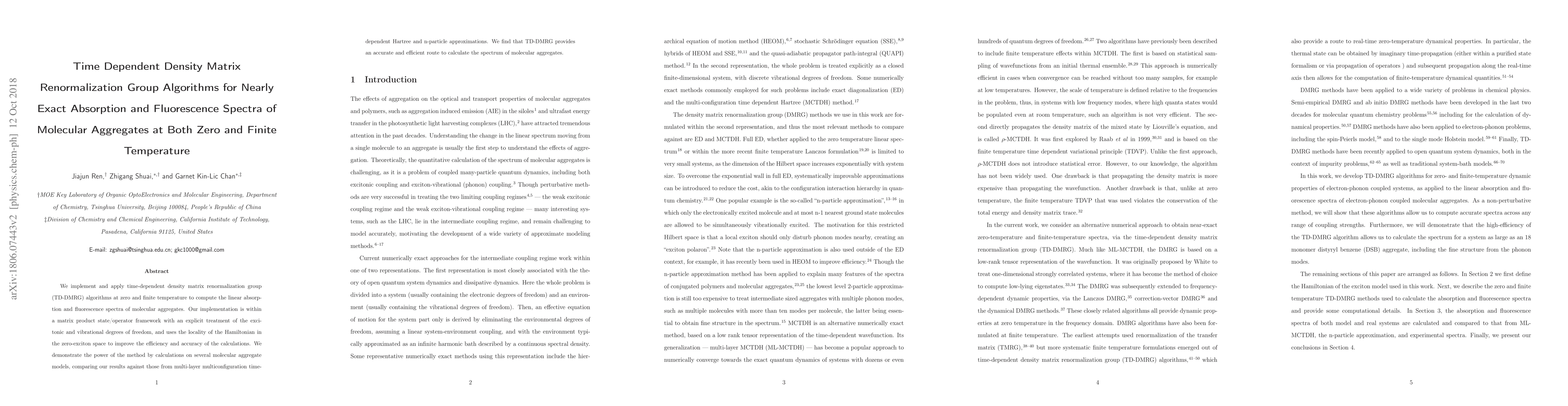 This paper implements time-dependent density matrix renormalization group (TD-DMRG) algorithms to compute absorption and fluorescence spectra of molecular aggregates at zero and finite temperatures. The method shows high accuracy and efficiency compared to other approximations, demonstrating its effectiveness through calculations on various molecular models.