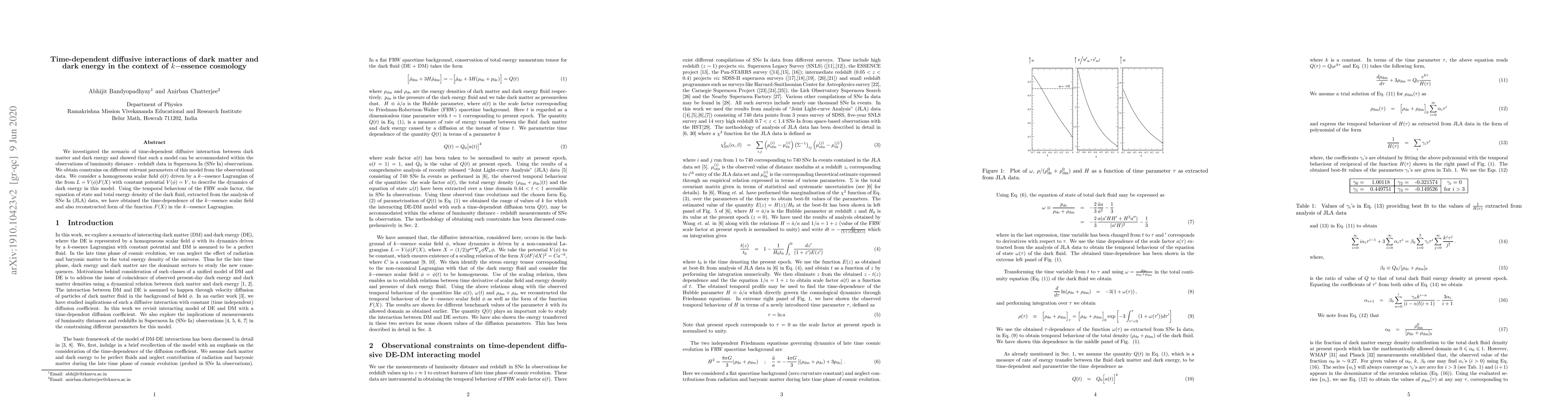 We investigated the scenario of time-dependent diffusive interaction between dark matter and dark energy and showed that such a model can be accommodated within the observations of luminosity distance - redshift data in Supernova Ia (SNe Ia) observations. We obtain constrains on different relevant parameters of this model from the observational data. We consider a homogeneous scalar field $\phi(t)$ driven by a $k-$essence Lagrangian of the from $L = V(\phi)F(X)$ with constant potential $V(\phi) = V$, to describe the dynamics of dark energy in this model. Using the temporal behaviour of the FRW scale factor, the equation of state and total energy density of the dark fluid, extracted from the analysis of SNe Ia (JLA) data, we have obtained the time-dependence of the $k-$essence scalar field and also reconstructed form of the function $F(X)$ in the $k-$essence Lagrangian.