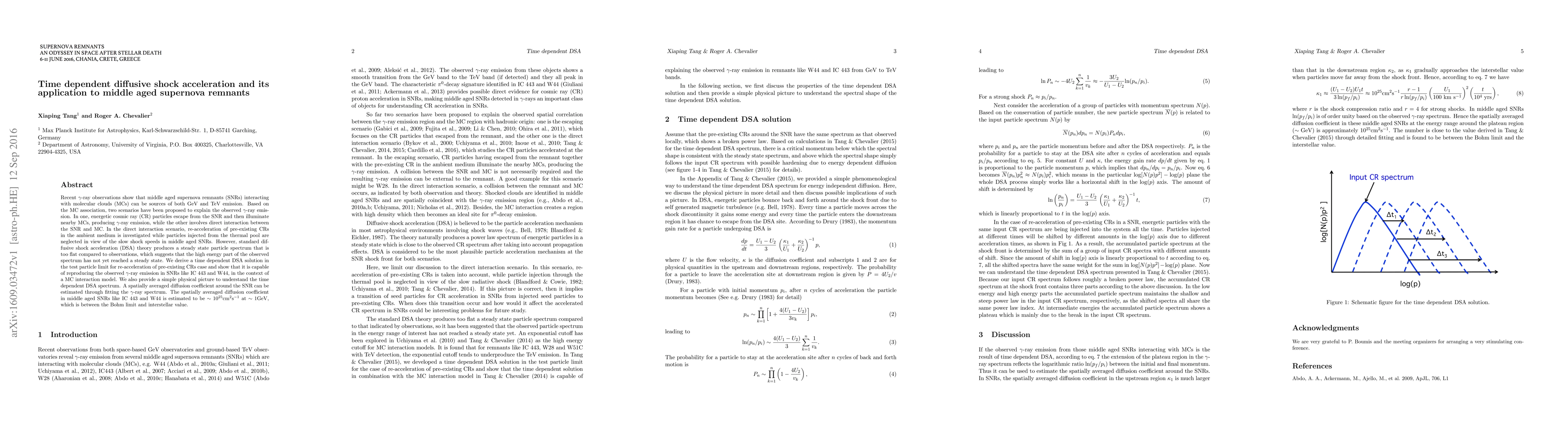 This paper proposes a time-dependent diffusive shock acceleration (DSA) model to explain the observed gamma-ray emissions from middle-aged supernova remnants (SNRs) interacting with molecular clouds. The model successfully reproduces the observed gamma-ray spectrum, suggesting that the high-energy particles have not yet reached a steady state, and estimates a spatially averaged diffusion coefficient of ~10^25 cm^2/s at ~1GeV.