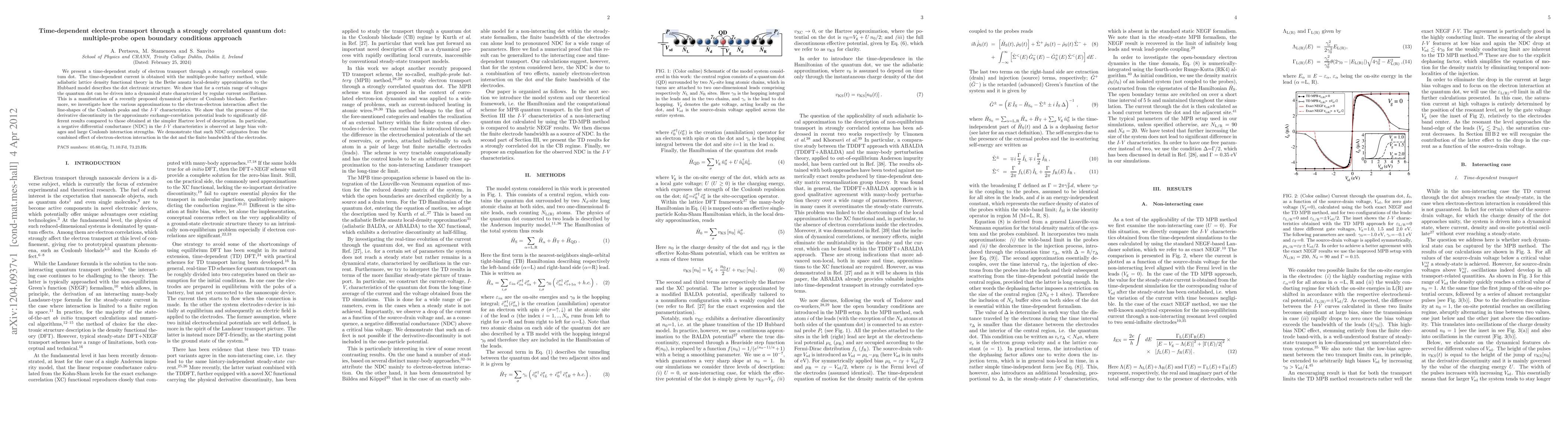 This paper investigates time-dependent electron transport through a strongly correlated quantum dot using the multiple-probe battery method, revealing regular current oscillations under certain voltages indicative of a dynamical Coulomb blockade. It also explores the impact of different electron-electron interaction approximations, showing that the presence of derivative discontinuity in the exchange-correlation potential leads to negative differential conductance due to electron-electron interactions and finite electrode bandwidth.