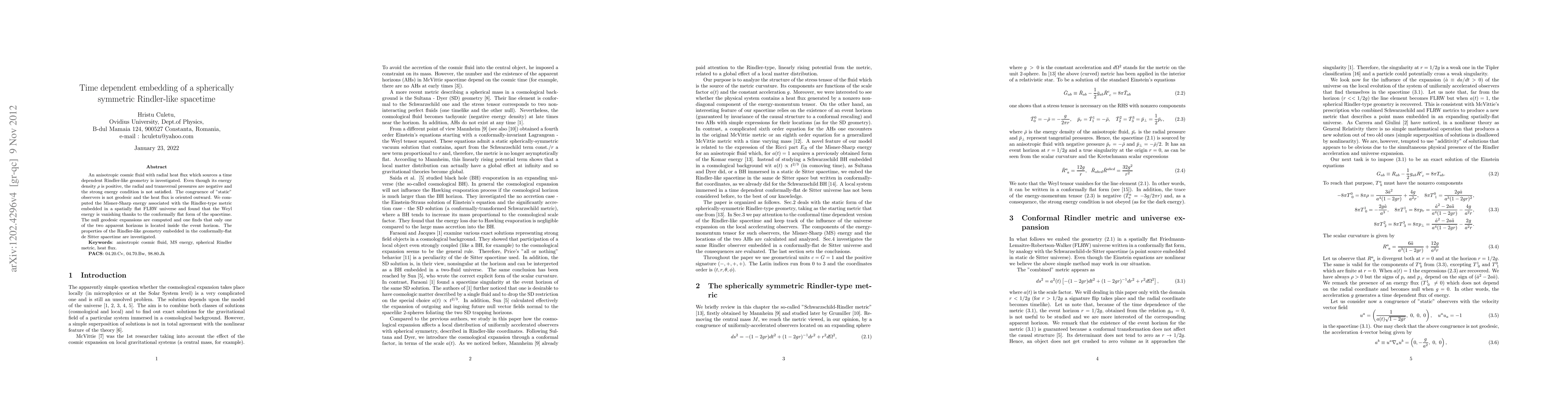 An anisotropic cosmic fluid with radial heat flux which sources a time dependent Rindler-like geometry is investigated. Even though its energy density $\rho$ is positive, the radial and transversal pressures are negative and the strong energy condition is not satisfied. The congruence of "static" observers is not geodesic and the heat flux is oriented outward. We computed the Misner-Sharp energy associated with the Rindler-type metric embedded in a spatially flat FLRW universe and found that the Weyl energy is vanishing thanks to the conformally flat form of the spacetime. The null geodesic expansions are computed and one finds that only one of the two apparent horizons is located inside the event horizon. The properties of the Rindler-like geometry embedded in the conformally-flat de Sitter spacetime are investigated.