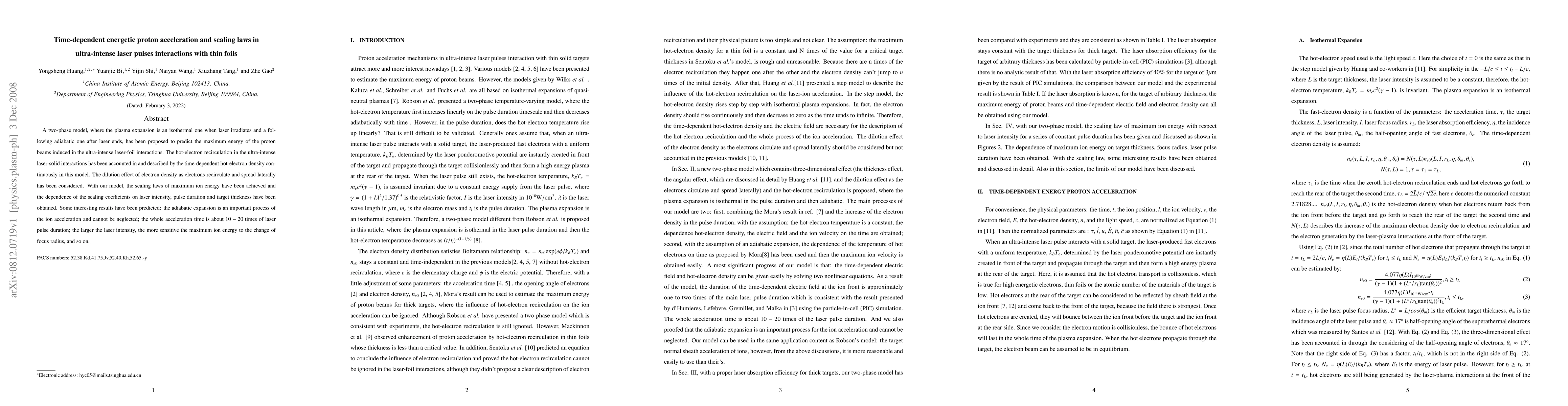 A two-phase model, where the plasma expansion is an isothermal one when laser irradiates and a following adiabatic one after laser ends, has been proposed to predict the maximum energy of the proton beams induced in the ultra-intense laser-foil interactions. The hot-electron recirculation in the ultra-intense laser-solid interactions has been accounted in and described by the time-dependent hot-electron density continuously in this model. The dilution effect of electron density as electrons recirculate and spread laterally has been considered. With our model, the scaling laws of maximum ion energy have been achieved and the dependence of the scaling coefficients on laser intensity, pulse duration and target thickness have been obtained. Some interesting results have been predicted: the adiabatic expansion is an important process of the ion acceleration and cannot be neglected; the whole acceleration time is about 10-20 times of laser pulse duration; the larger the laser intensity, the more sensitive the maximum ion energy to the change of focus radius, and so on.