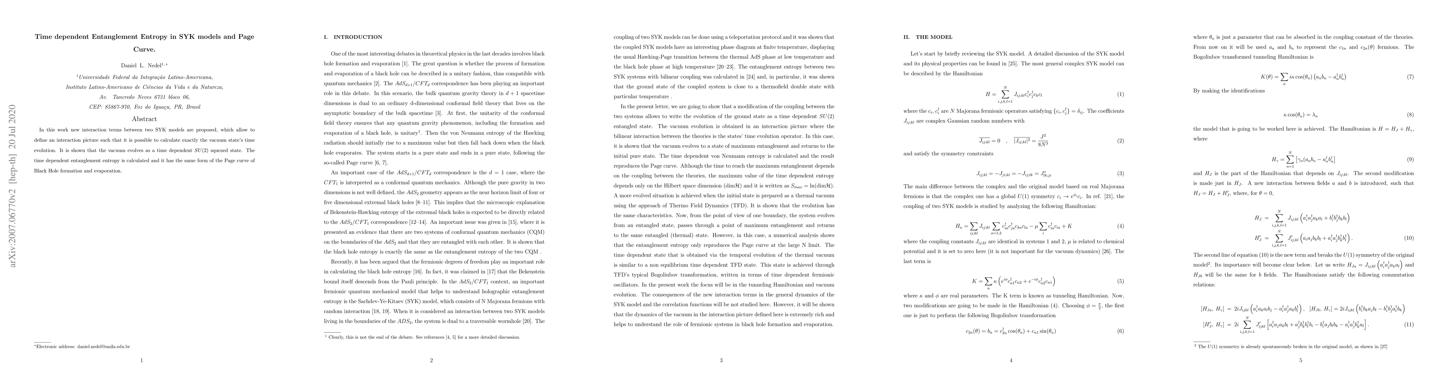 Researchers propose new interaction terms for SYK models to calculate exact vacuum state evolution, finding it follows a time-dependent $SU(2)$ squeezed state with entanglement entropy matching the Page curve of Black Hole formation and evaporation.
