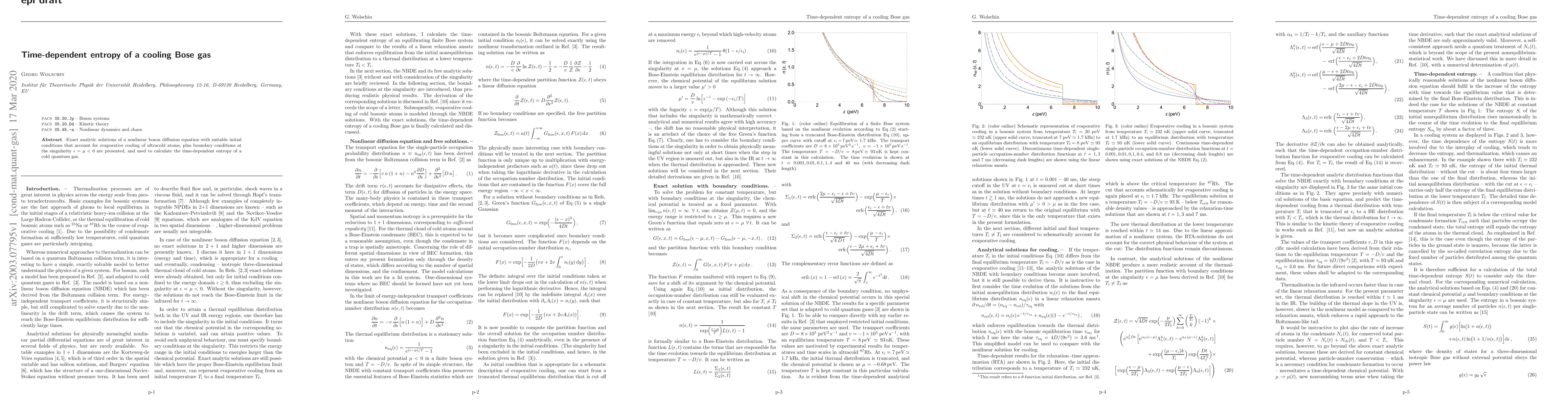 Exact analytic solutions of a nonlinear boson diffusion equation with suitable initial conditions that account for evaporative cooling of ultracold atoms, plus boundary conditions at the singularity $\epsilon=\mu<0$ are presented, and used to calculate the time-dependent entropy of a cold quantum gas.