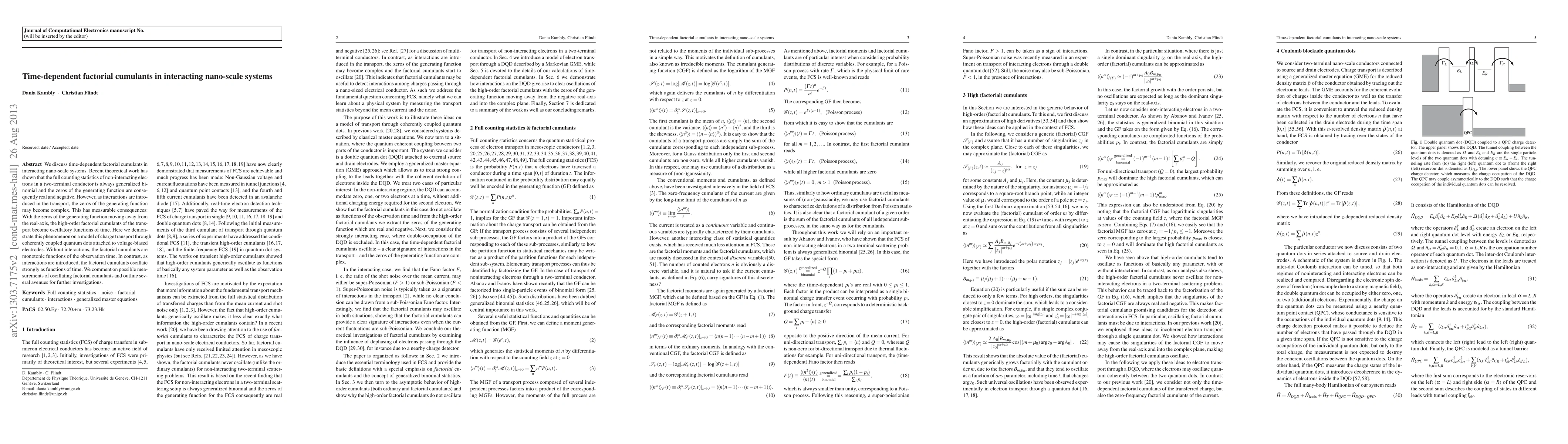 This paper investigates the time-dependent factorial cumulants in interacting nano-scale systems, showing that interactions lead to oscillatory behavior in high-order cumulants, contrasting with the monotonic behavior in non-interacting systems. The study uses a model of charge transport through quantum dots to demonstrate these effects.