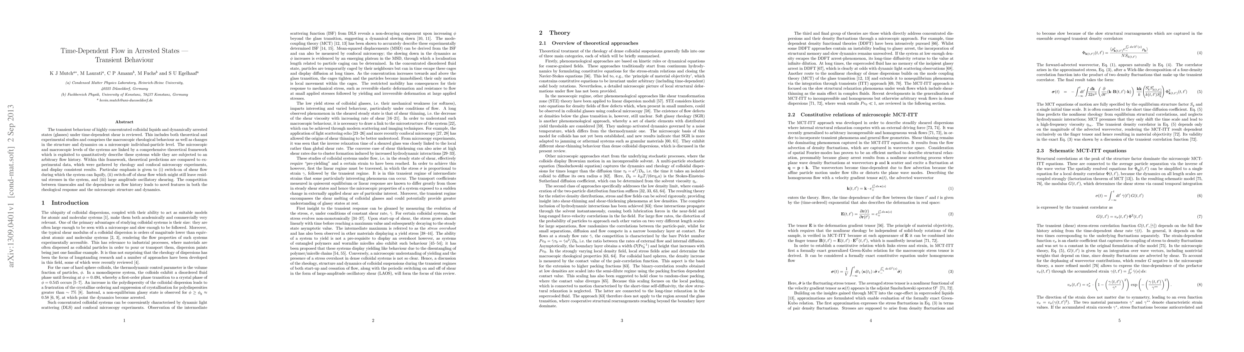 This paper reviews transient behavior of highly concentrated colloidal liquids and dynamically arrested states under time-dependent shear, linking microscopic and macroscopic levels via a theoretical framework. Experiments using rheology and confocal microscopy validate predictions, highlighting unique features in response to shear flow switch-on, switch-off, and large amplitude oscillatory shearing.