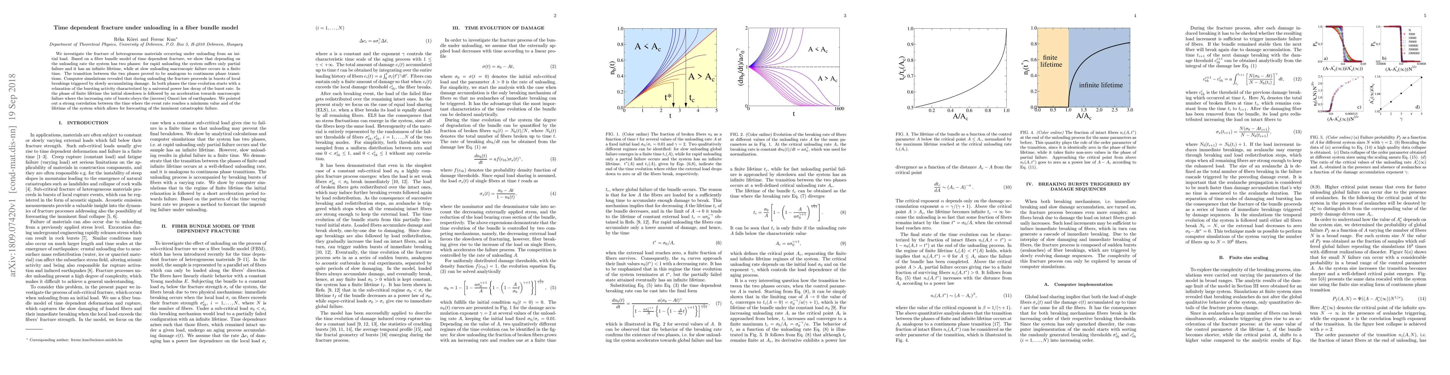 This paper explores the fracture behavior of heterogeneous materials under unloading using a fiber bundle model, revealing two phases: rapid unloading leads to partial failure with infinite lifetime, while slow unloading results in finite-time macroscopic failure, akin to continuous phase transitions. Simulations show fracture proceeds in bursts, with a universal power law decay in burst rate during relaxation.