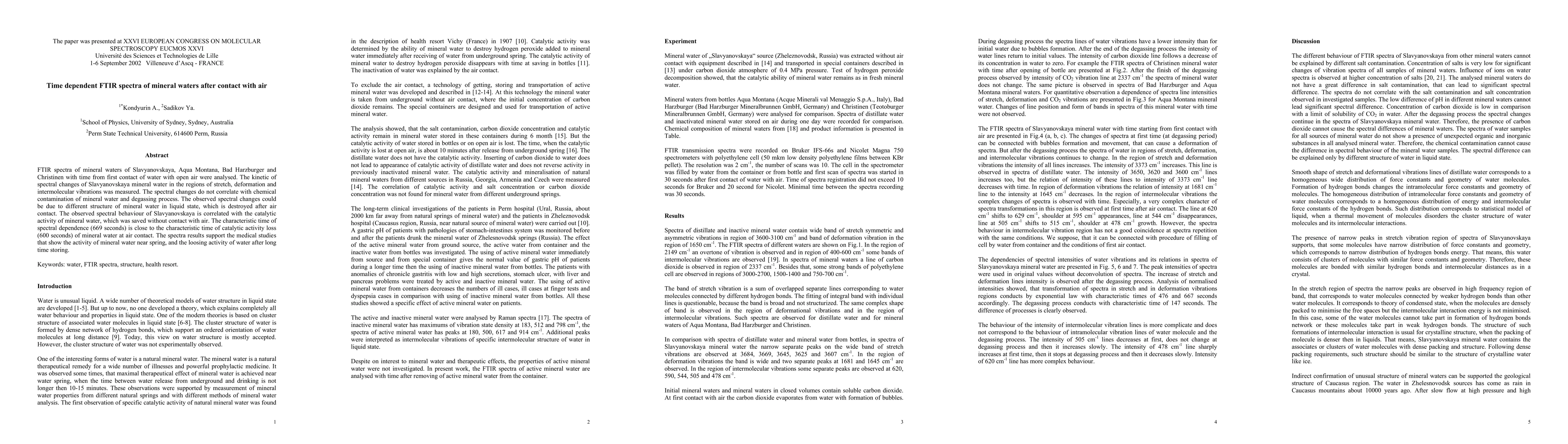 FTIR spectra of mineral waters of Slavyanovskaya, Aqua Montana, Bad Harzburger and Christinen with time from first contact of water with open air were analysed. The kinetic of spectral changes of Slavyanovskaya mineral water in the regions of stretch, deformation and intermolecular vibrations was measured. The spectral changes do not correlate with chemical contamination of mineral water and degassing process. The observed spectral changes could be due to different structure of mineral water in liquid state, which is destroyed after air contact. The observed spectral behaviour of Slavyanovskaya is correlated with the catalytic activity of mineral water, which was saved without contact with air. The characteristic time of spectral dependence (669 seconds) is close to the characteristic time of catalytic activity loss (600 seconds) of mineral water at air contact. The spectra results support the medical studies that show the activity of mineral water near spring, and the loosing activity of water after long time storing.
