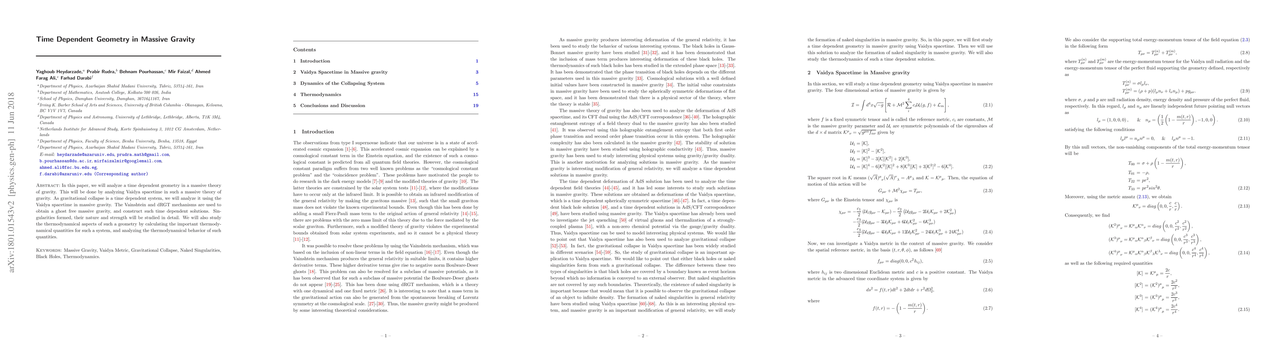In this paper, we will analyze a time dependent geometry in a massive theory of gravity. This will be done by analyzing Vaidya space-time in such a massive theory of gravity. As gravitational collapse is a time dependent system, we will analyze it using the Vaidya space-time in massive gravity. The Vainshtein and dRGT mechanisms are used to obtain a ghost free massive gravity, and construct such time dependent solutions. Singularities formed, their nature and strength will be studied in detail. We will also study the thermodynamical aspects of such a geometry by calculating the important thermodynamical quantities for such a system, and analyzing the thermodynamical behavior of such quantities.