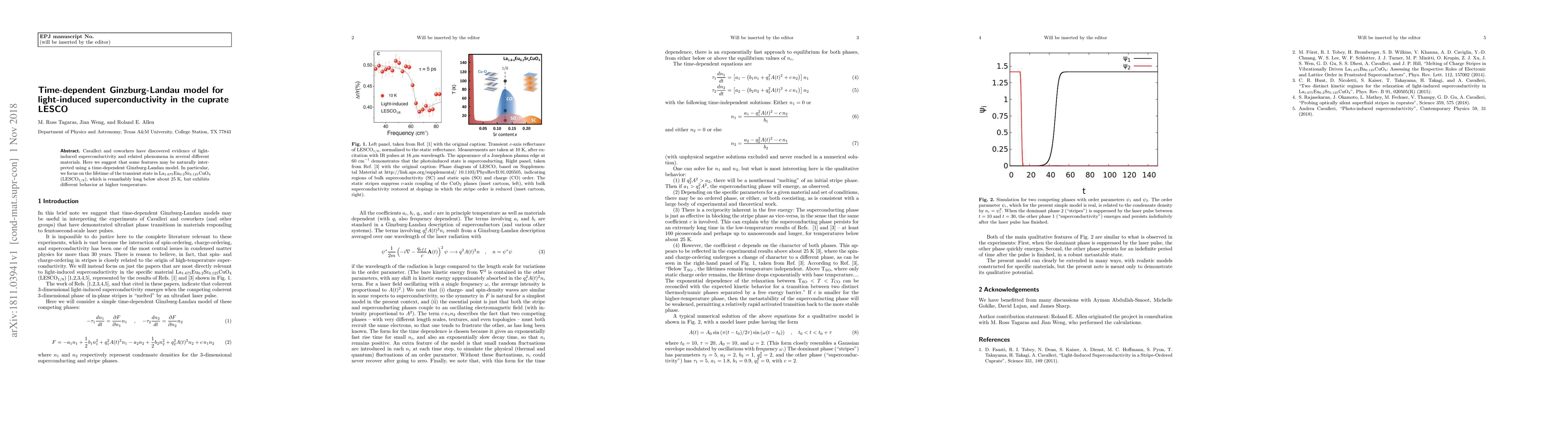 This paper proposes a time-dependent Ginzburg-Landau model to explain light-induced superconductivity in the cuprate LESCO, highlighting the extended lifetime of the transient state below 25 K and contrasting it with different behavior at higher temperatures.