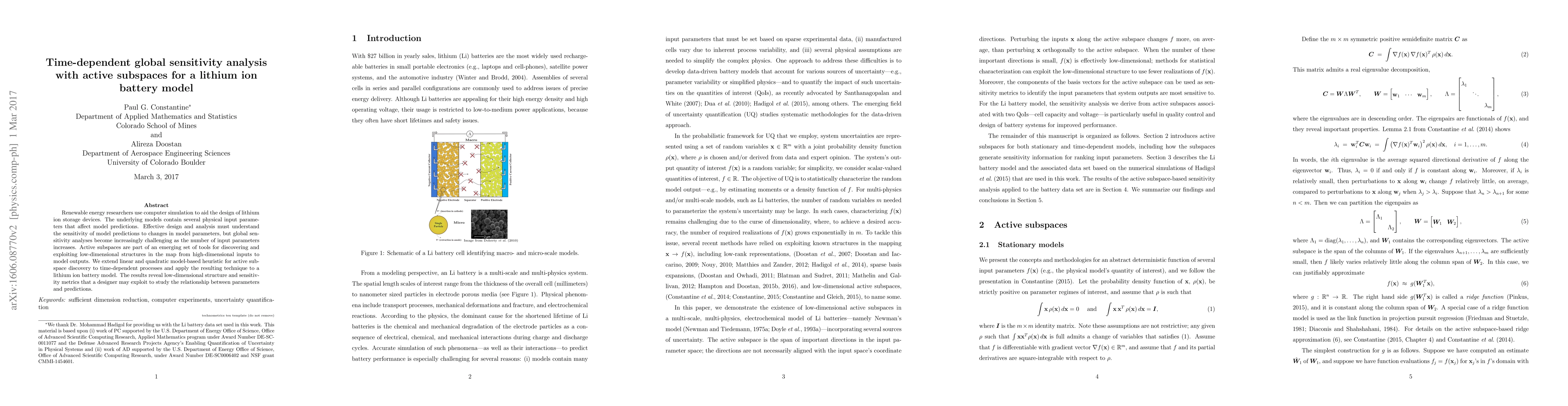 Renewable energy researchers use computer simulation to aid the design of lithium ion storage devices. The underlying models contain several physical input parameters that affect model predictions. Effective design and analysis must understand the sensitivity of model predictions to changes in model parameters, but global sensitivity analyses become increasingly challenging as the number of input parameters increases. Active subspaces are part of an emerging set of tools for discovering and exploiting low-dimensional structures in the map from high-dimensional inputs to model outputs. We extend linear and quadratic model-based heuristic for active sub- space discovery to time-dependent processes and apply the resulting technique to a lithium ion battery model. The results reveal low-dimensional structure and sensitivity metrics that a designer may exploit to study the relationship between parameters and predictions.
