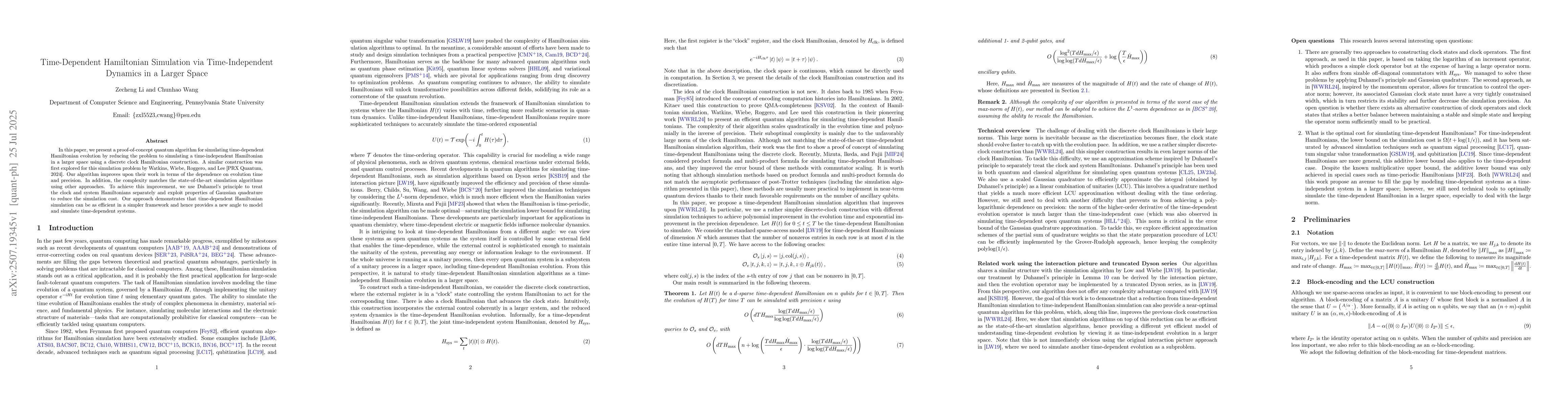 In this paper, we present a proof-of-concept quantum algorithm for simulating time-dependent Hamiltonian evolution by reducing the problem to simulating a time-independent Hamiltonian in a larger space using a discrete clock Hamiltonian construction. A similar construction was first explored for this simulation problem by Watkins, Wiebe, Roggero, and Lee [PRX Quantum, 2024]. Our algorithm improves upon their work in terms of the dependence on evolution time and precision. In addition, the complexity matches the state-of-the-art simulation algorithms using other approaches. To achieve this improvement, we use Duhamel's principle to treat the clock and system Hamiltonians separately and exploit properties of Gaussian quadrature to reduce the simulation cost. Our approach demonstrates that time-dependent Hamiltonian simulation can be as efficient in a simpler framework and hence provides a new angle to model and simulate time-dependent systems.