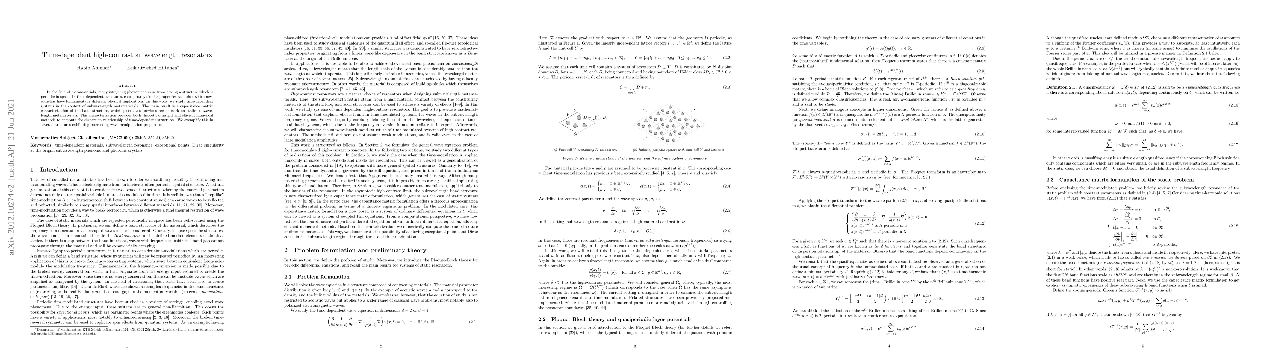 In the field of metamaterials, many intriguing phenomena arise from having a structure which is periodic in space. In time-dependent structures, conceptually similar properties can arise, which nevertheless have fundamentally different physical implications. In this work, we study time-dependent systems in the context of subwavelength metamaterials. The main result is a capacitance matrix characterization of the band structure, which generalizes previous recent work on static subwavelength metamaterials. This characterization provides both theoretical insight and efficient numerical methods to compute the dispersion relationship of time-dependent structures. We exemplify this in several structures exhibiting interesting wave manipulation properties.