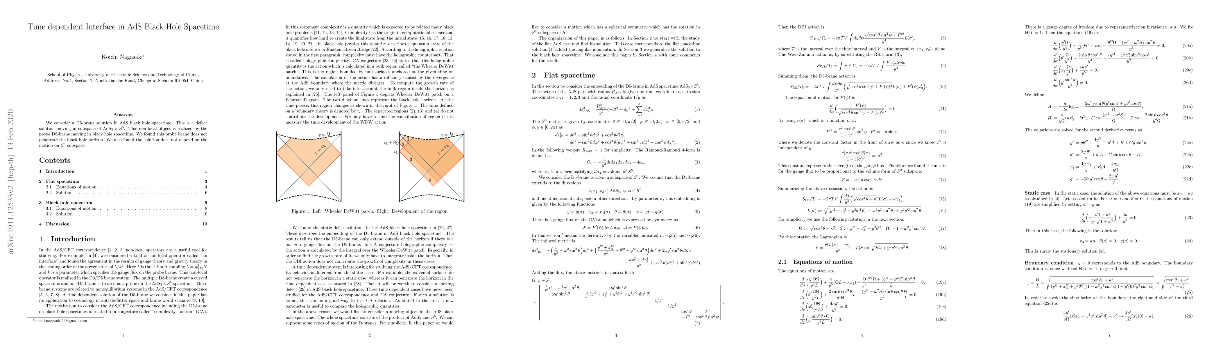 The research examines a D5-brane in an AdS black hole spacetime, finding it doesn't cross the horizon and its motion isn't influenced by movement in the S5 subspace, suggesting a stable, non-local defect solution.
