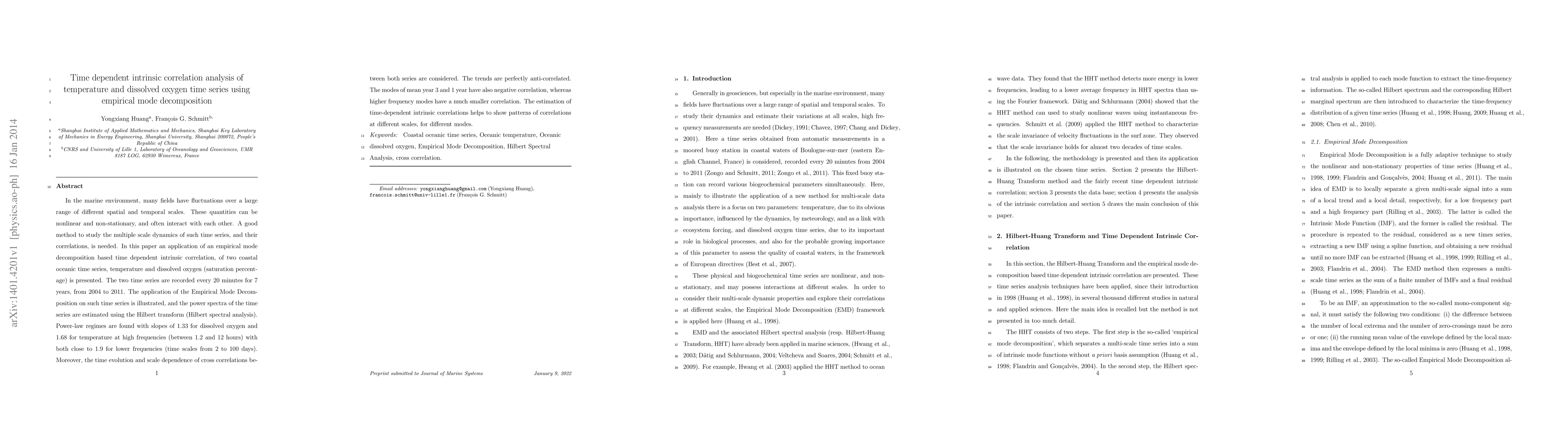 This paper applies empirical mode decomposition to analyze time-dependent intrinsic correlations between coastal oceanic temperature and dissolved oxygen time series recorded every 20 minutes over 7 years. The study reveals anti-correlated trends and varying correlation strengths across different frequency modes.
