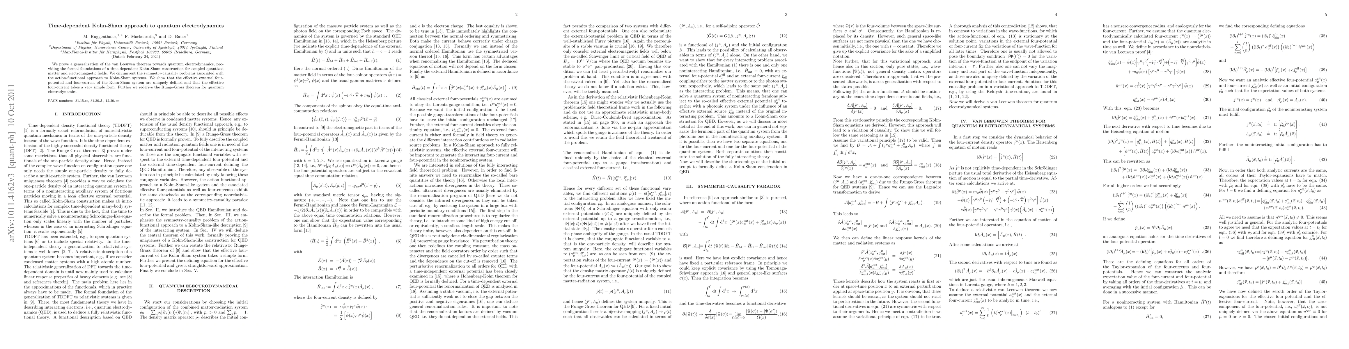 This paper generalizes the van Leeuwen theorem for quantum electrodynamics, establishing a time-dependent Kohn-Sham framework for quantized matter and electromagnetic fields, thereby resolving symmetry-causality issues. It uniquely defines the effective external four-potential and four-current, and rederives the Runge-Gross theorem for this context.