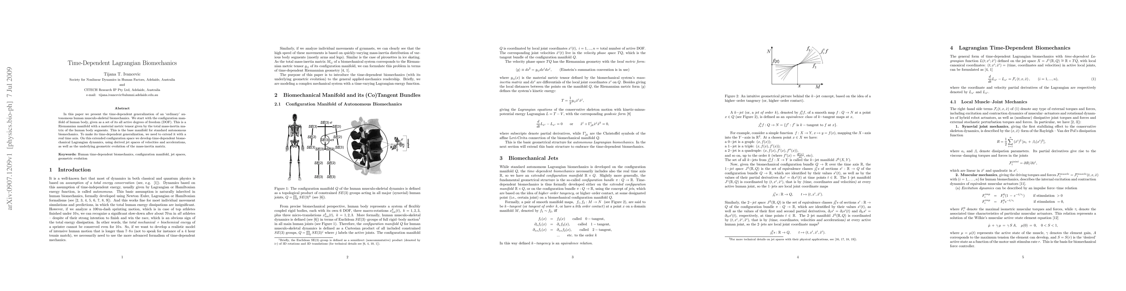 In this paper we present the time-dependent generalization of an 'ordinary' autonomous human musculo-skeletal biomechanics. We start with the configuration manifold of human body, given as a set of its all active degrees of freedom (DOF). This is a Riemannian manifold with a material metric tensor given by the total mass-inertia matrix of the human body segments. This is the base manifold for standard autonomous biomechanics. To make its time-dependent generalization, we need to extend it with a real time axis. On this extended configuration space we develop time-dependent biomechanical Lagrangian dynamics, using derived jet spaces of velocities and accelerations, as well as the underlying geometric evolution of the mass-inertia matrix. Keywords: Human time-dependent biomechanics, configuration manifold, jet spaces, geometric evolution