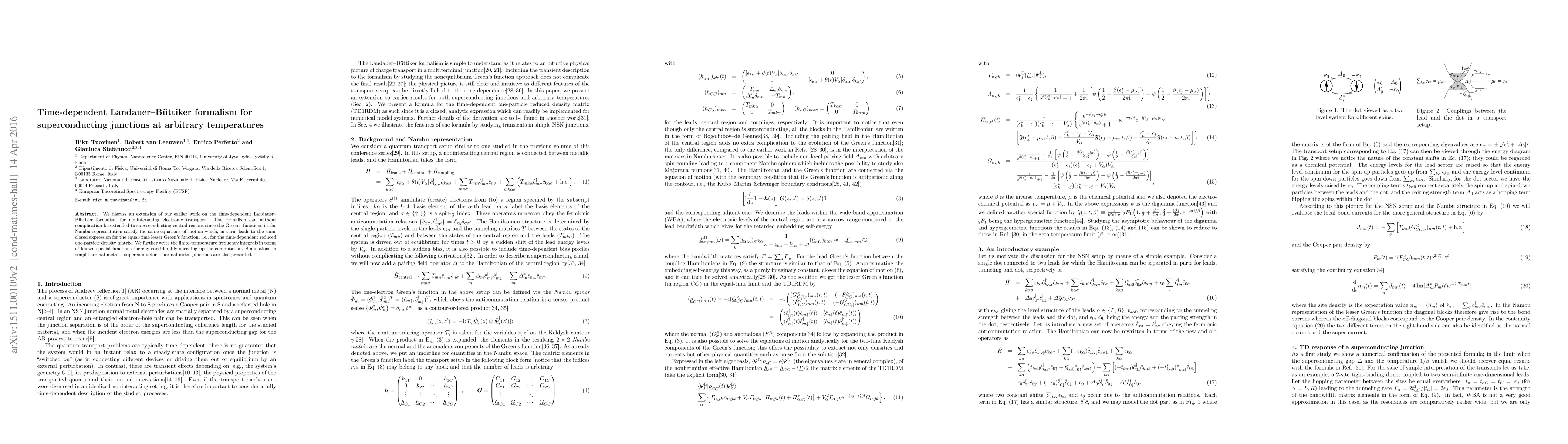 We discuss an extension of our earlier work on the time-dependent Landauer--B\"uttiker formalism for noninteracting electronic transport. The formalism can without complication be extended to superconducting central regions since the Green's functions in the Nambu representation satisfy the same equations of motion which, in turn, leads to the same closed expression for the equal-time lesser Green's function, i.e., for the time-dependent reduced one-particle density matrix. We further write the finite-temperature frequency integrals in terms of known special functions thereby considerably speeding up the computation. Numerical simulations in simple normal metal -- superconductor -- normal metal junctions are also presented.