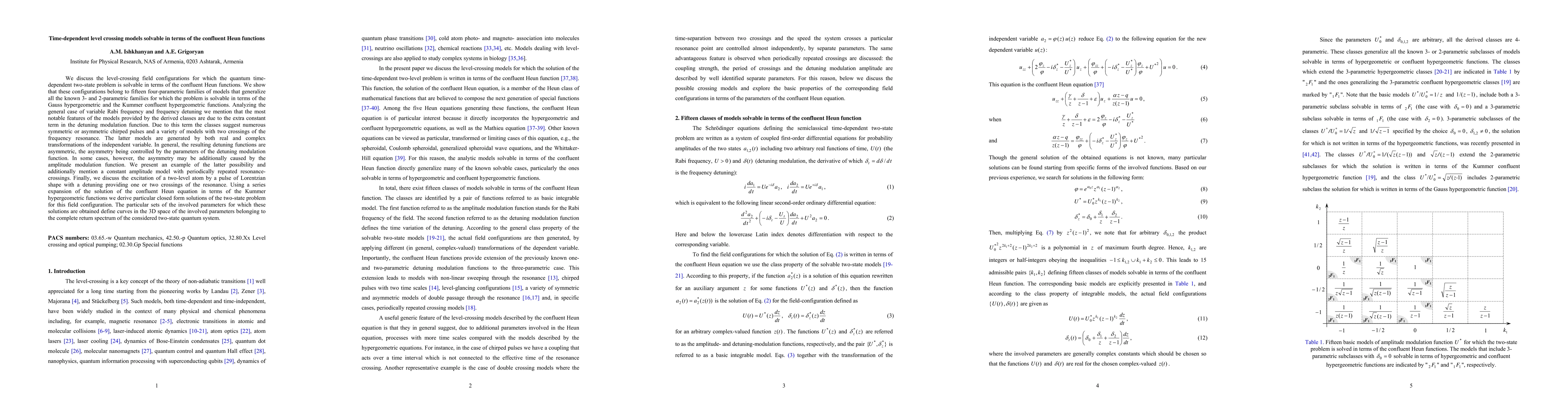 This paper explores time-dependent level crossing models solvable via confluent Heun functions, identifying fifteen four-parametric families that generalize known solvable models. It highlights the asymmetric features and chirped pulses generated by the models, and presents closed-form solutions for specific configurations.