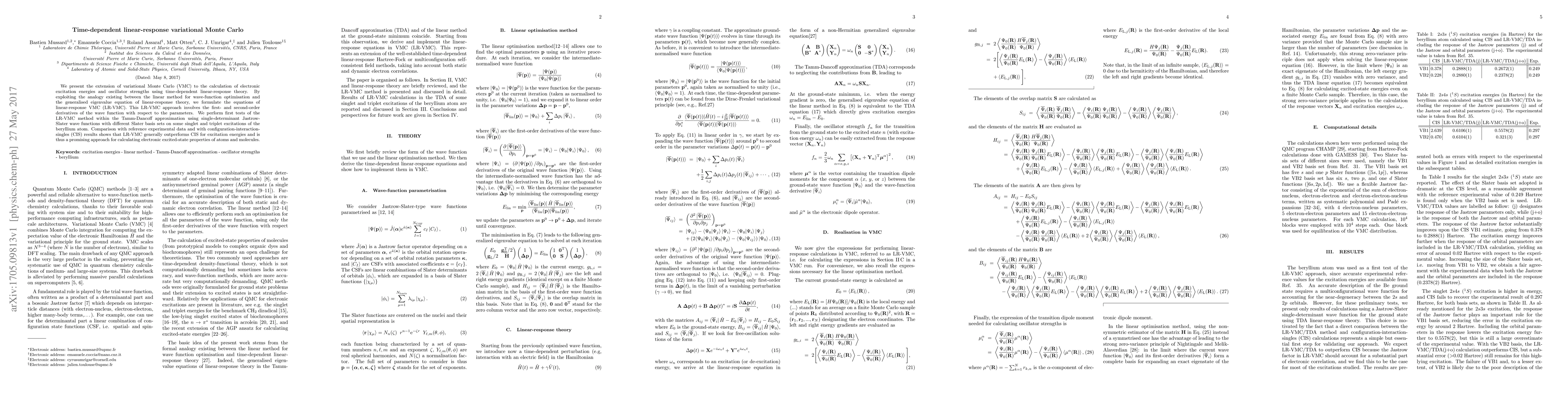 The paper presents a formulation of time-dependent linear-response theory within the VMC framework using a Jastrow-Slater wave function, allowing for the explicit treatment of a part of dynamical correlation.