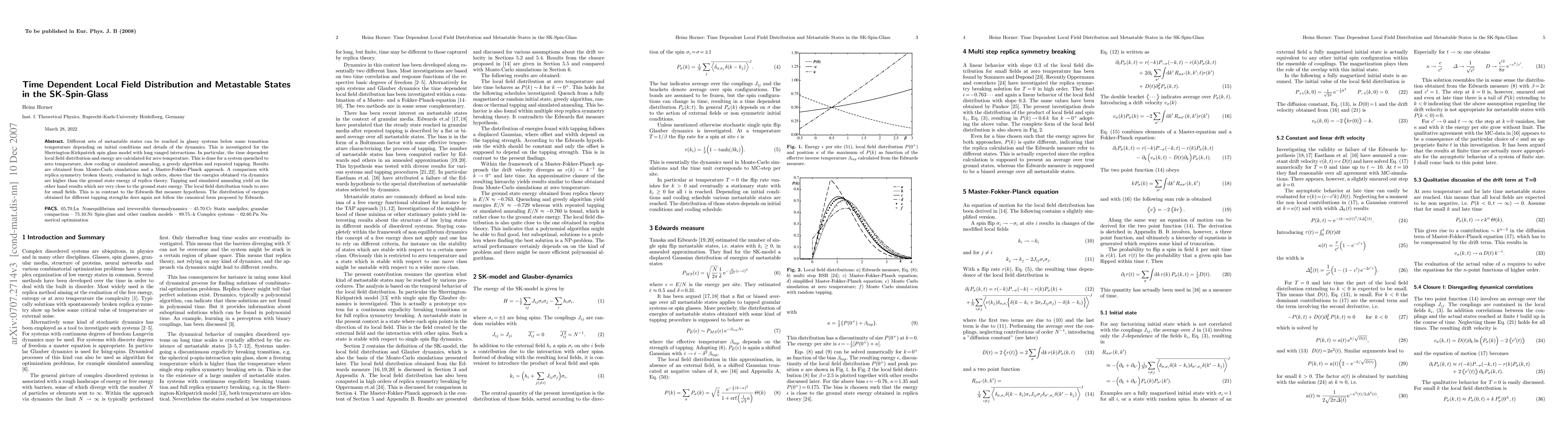 Different sets of metastable states can be reached in glassy systems below some transition temperature depending on initial conditions and details of the dynamics. This is investigated for the Sherrington-Kirkpatrick spin glass model with long ranged interactions. In particular, the time dependent local field distribution and energy are calculated for zero temperature. This is done for a system quenched to zero temperature, slow cooling or simulated annealing, a greedy algorithm and repeated tapping. Results are obtained from Monte-Carlo simulations and a Master-Fokker-Planck approach. A comparison with replica symmetry broken theory, evaluated in high orders, shows that the energies obtained via dynamics are higher than the ground state energy of replica theory. Tapping and simulated annealing yield on the other hand results which are very close to the ground state energy. The local field distribution tends to zero for small fields. This is in contrast to the Edwards flat measure hypothesis. The distribution of energies obtained for different tapping strengths does again not follow the canonical form proposed by Edwards.