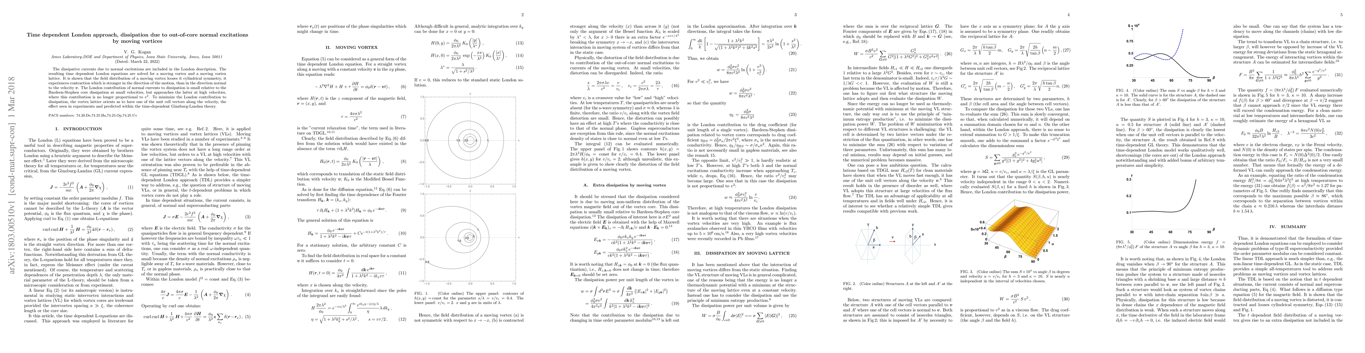 The dissipative currents due to normal excitations are included in the London description. The resulting time dependent London equations are solved for a moving vortex and a moving vortex lattice. It is shown that the field distribution of a moving vortex looses it cylindrical symmetry, it experiences contraction which is stronger in the direction of the motion, than in the direction normal to the velocity $\bm v$. The London contribution of normal currents to dissipation is small relative to the Bardeen-Stephen core dissipation at small velocities, but approaches the latter at high velocities, where this contribution is no longer proportional to $v^2$. To minimize the London contribution to dissipation, the vortex lattice orients as to have one of the unit cell vectors along the velocity, the effect seen in experiments and predicted within the time-dependent Ginzburg-Landau theory.