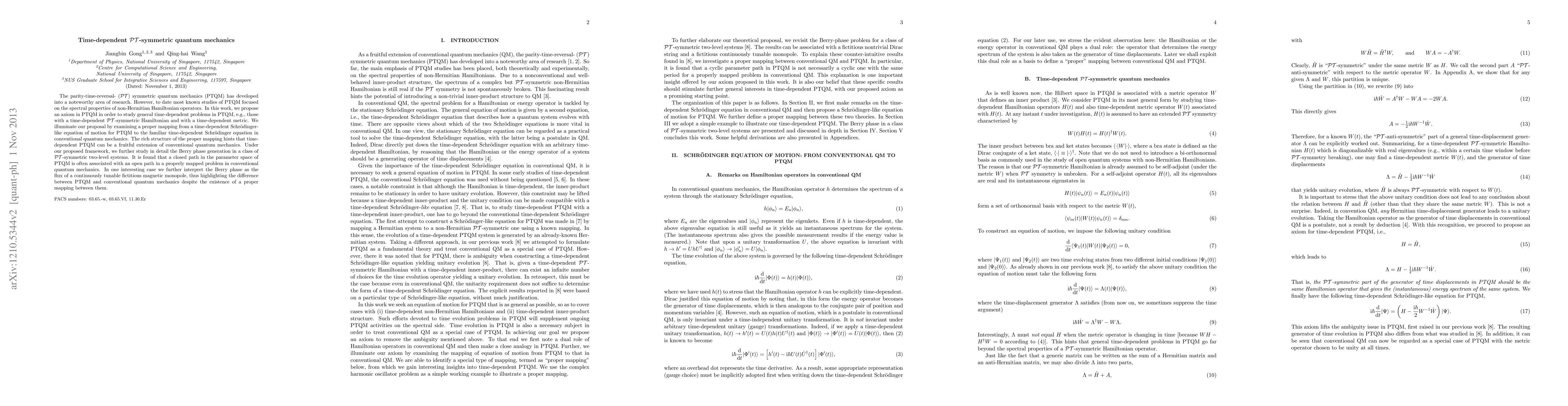 The parity-time-reversal- ($\mathcal{PT}$) symmetric quantum mechanics (PTQM) has developed into a noteworthy area of research. However, to date most known studies of PTQM focused on the spectral properties of non-Hermitian Hamiltonian operators. In this work, we propose an axiom in PTQM in order to study general time-dependent problems in PTQM, e.g., those with a time-dependent $\mathcal{PT}$-symmetric Hamiltonian and with a time-dependent metric. We illuminate our proposal by examining a proper mapping from a time-dependent Schr\"odinger-like equation of motion for PTQM to the familiar time-dependent Schr\"odinger equation in conventional quantum mechanics. The rich structure of the proper mapping hints that time-dependent PTQM can be a fruitful extension of conventional quantum mechanics. Under our proposed framework, we further study in detail the Berry phase generation in a class of $\mathcal{PT}$-symmetric two-level systems. It is found that a closed path in the parameter space of PTQM is often associated with an open path in a properly mapped problem in conventional quantum mechanics. In one interesting case we further interpret the Berry phase as the flux of a continuously tunable fictitious magnetic monopole, thus highlighting the difference between PTQM and conventional quantum mechanics despite the existence of a proper mapping between them.