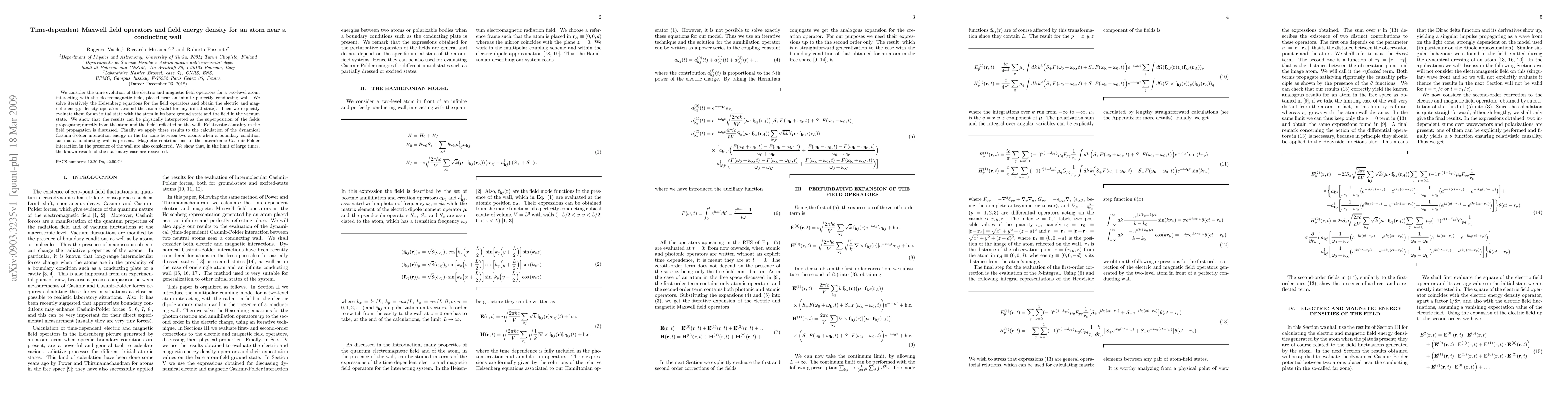 We consider the time evolution of the electric and magnetic field operators for a two-level atom, interacting with the electromagnetic field, placed near an infinite perfectly conducting wall. We solve iteratively the Heisenberg equations for the field operators and obtain the electric and magnetic energy density operators around the atom (valid for any initial state). Then we explicitly evaluate them for an initial state with the atom in its bare ground state and the field in the vacuum state. We show that the results can be physically interpreted as the superposition of the fields propagating directly from the atom and the fields reflected on the wall. Relativistic causality in the field propagation is discussed. Finally we apply these results to the calculation of the dynamical Casimir-Polder interaction energy in the far zone between two atoms when a boundary condition such as a conducting wall is present. Magnetic contributions to the interatomic Casimir-Polder interaction in the presence of the wall are also considered. We show that, in the limit of large times, the known results of the stationary case are recovered.