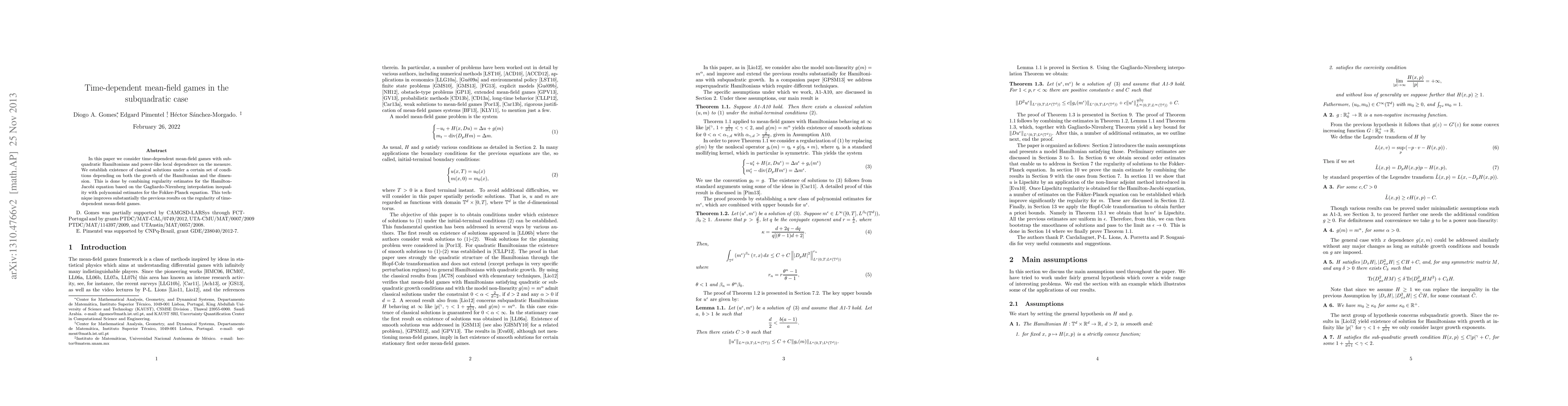This paper establishes the existence of classical solutions for time-dependent mean-field games with subquadratic Hamiltonians, leveraging a combination of regularity estimates for the Hamilton-Jacobi equation and polynomial estimates for the Fokker-Planck equation. The approach significantly enhances the understanding of the regularity of such games.