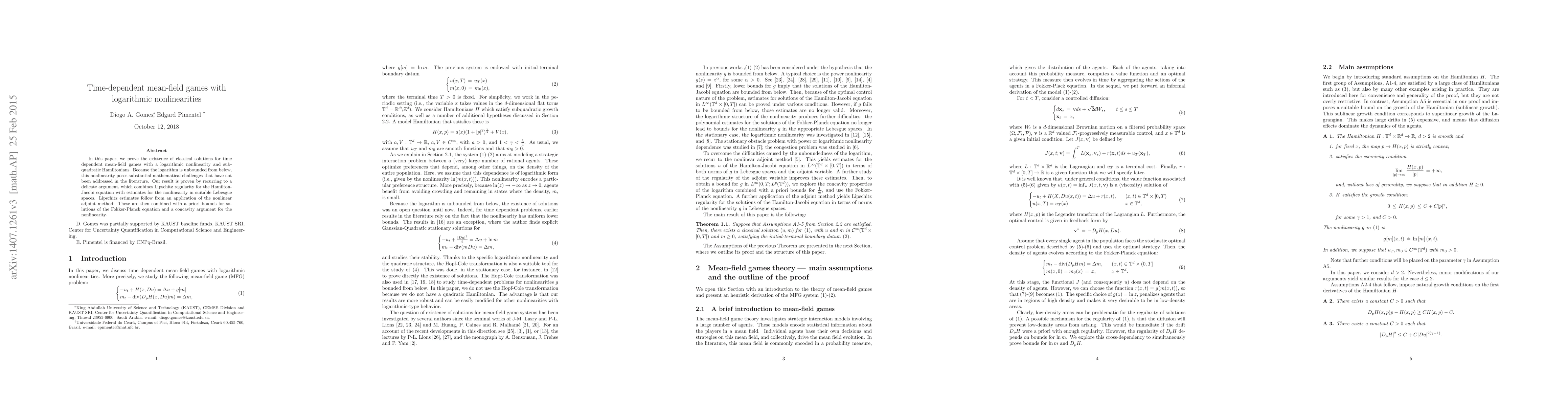 This paper establishes the existence of classical solutions for time-dependent mean-field games featuring logarithmic nonlinearities and subquadratic Hamiltonians. The authors overcome mathematical challenges posed by the unbounded nature of the logarithmic nonlinearity through a combination of Lipschitz regularity, nonlinear adjoint methods, and a priori bounds for Fokker-Planck equations.