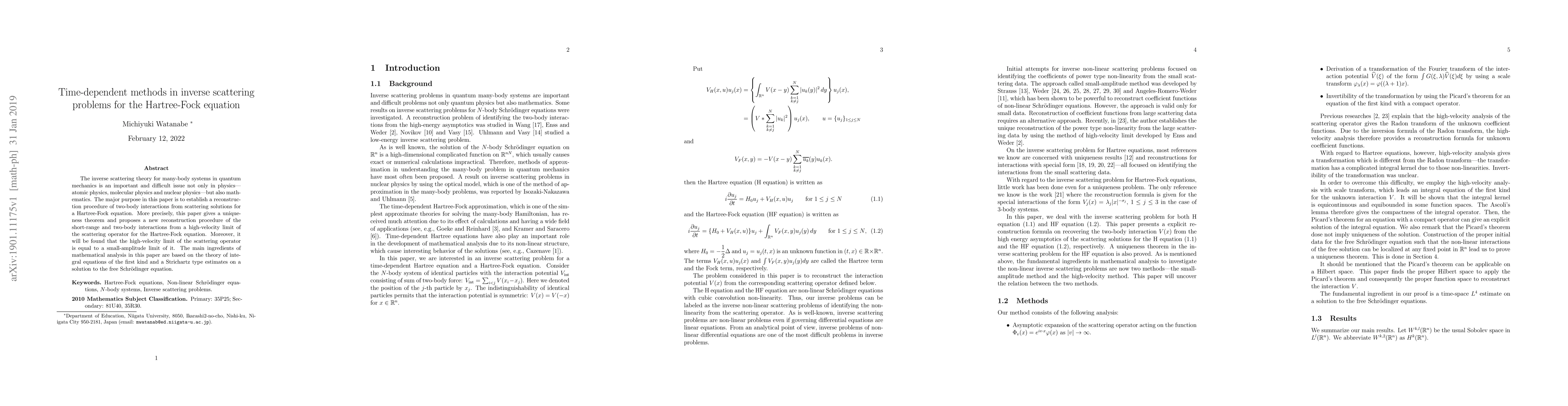 This paper develops a reconstruction procedure for two-body interactions in many-body quantum systems using inverse scattering theory for the Hartree-Fock equation. It establishes a uniqueness theorem and proposes a new method based on the high-velocity limit of the scattering operator, utilizing integral equations and Strichartz estimates.