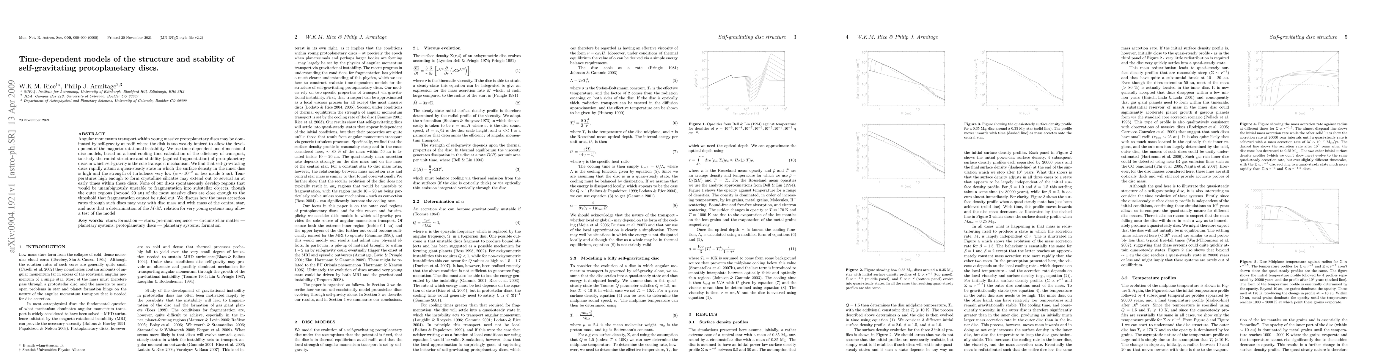 This paper investigates the structure and evolution of self-gravitating protoplanetary discs using time-dependent models, focusing on the role of self-gravity in angular momentum transport. The study finds that these discs reach a quasi-steady state with low turbulence and high temperatures conducive to silicate crystallization, but fragmentation into substellar objects is not spontaneously observed.