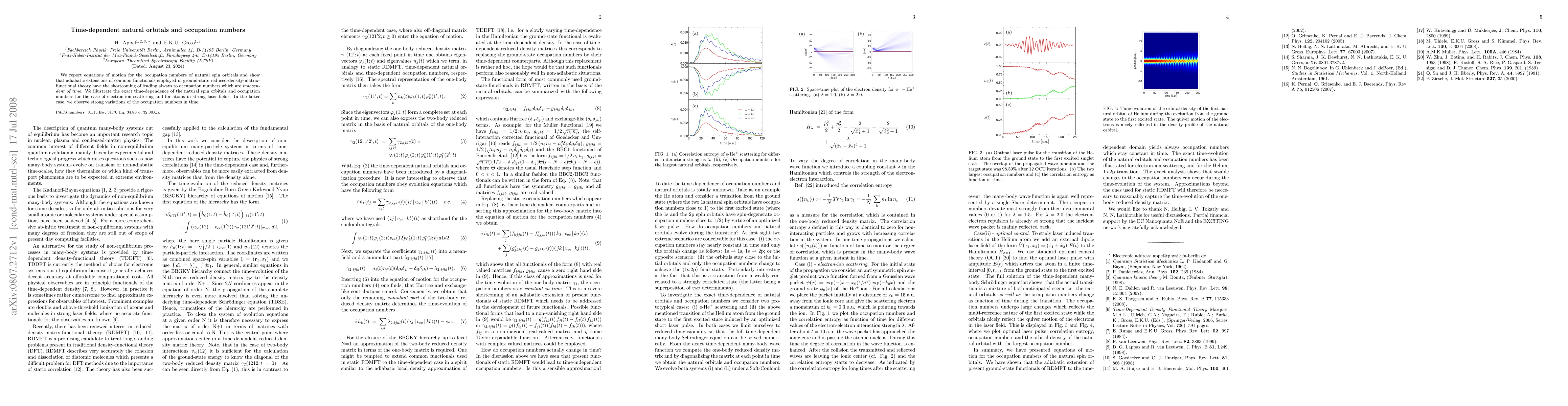 This paper presents equations of motion for natural spin orbitals' occupation numbers, highlighting that traditional functionals in reduced-density-matrix-functional theory fail to account for time-dependent occupation numbers. It demonstrates significant temporal variations in occupation numbers during electron-ion scattering and in atoms exposed to strong laser fields.