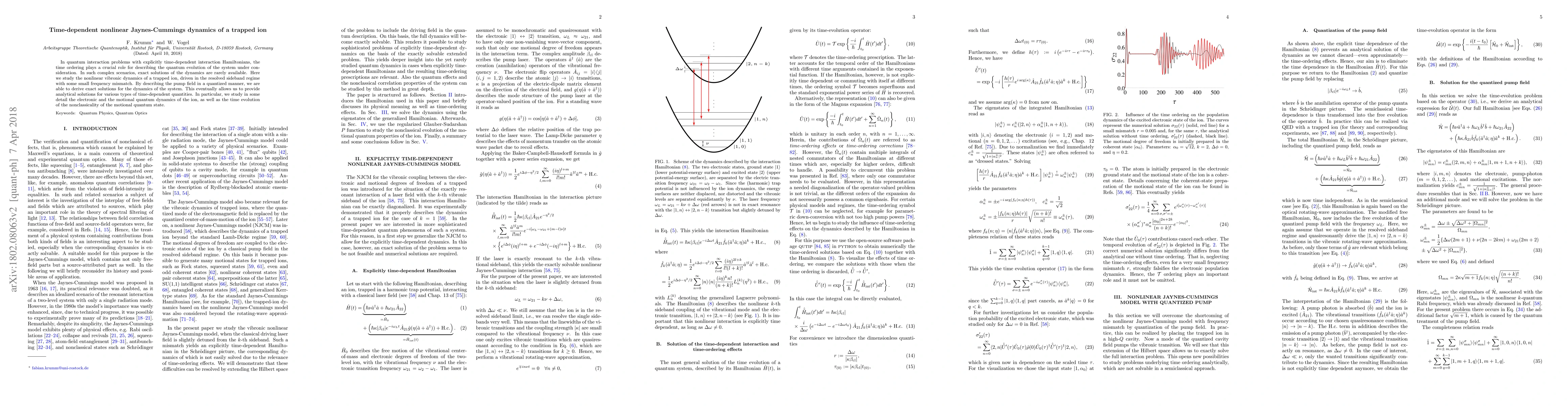 This paper investigates the nonlinear vibronic dynamics of a trapped ion under time-dependent interaction Hamiltonians, deriving exact solutions for its quantum evolution. Analytical expressions for electronic and motional quantum dynamics, as well as the time evolution of nonclassicality, are provided.