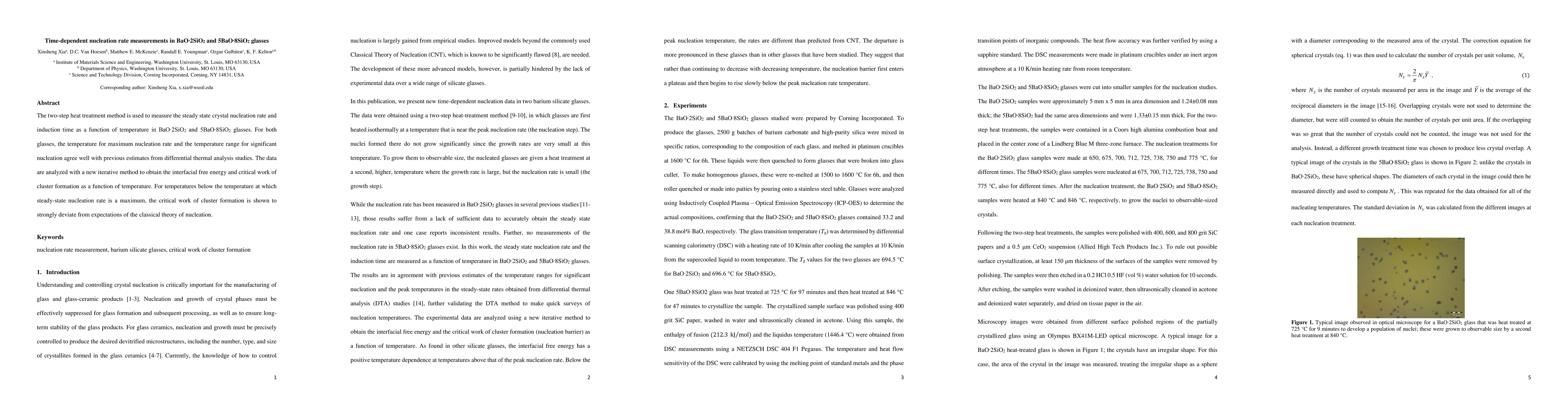 This study measures the steady-state nucleation rate and induction time in BaO.2SiO2 and 5BaO.8SiO2 glasses using a two-step heat treatment method, finding agreement with previous thermal analysis estimates. The new iterative method reveals deviations in the critical work of cluster formation below the temperature of maximum nucleation rate, challenging classical nucleation theory.