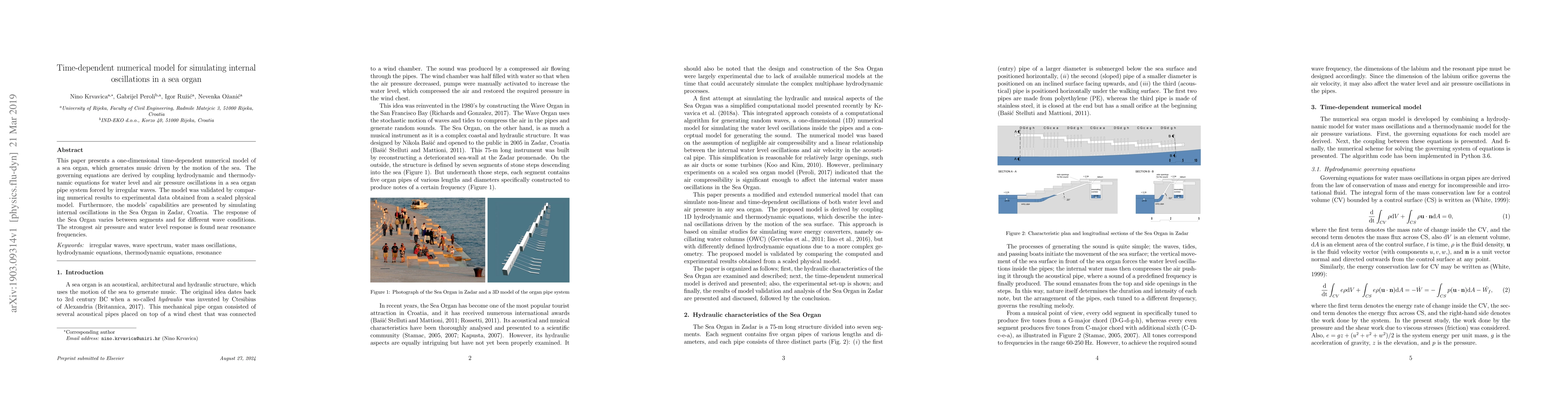 This paper presents a one-dimensional time-dependent numerical model of a sea organ, which generates music driven by the motion of the sea. The governing equations are derived by coupling hydrodynamic and thermodynamic equations for water level and air pressure oscillations in a sea organ pipe system forced by irregular waves. The model was validated by comparing numerical results to experimental data obtained from a scaled physical model. Furthermore, the models' capabilities are presented by simulating internal oscillations in the Sea Organ in Zadar, Croatia. The response of the Sea Organ varies between segments and for different wave conditions. The strongest air pressure and water level response is found near resonance frequencies.