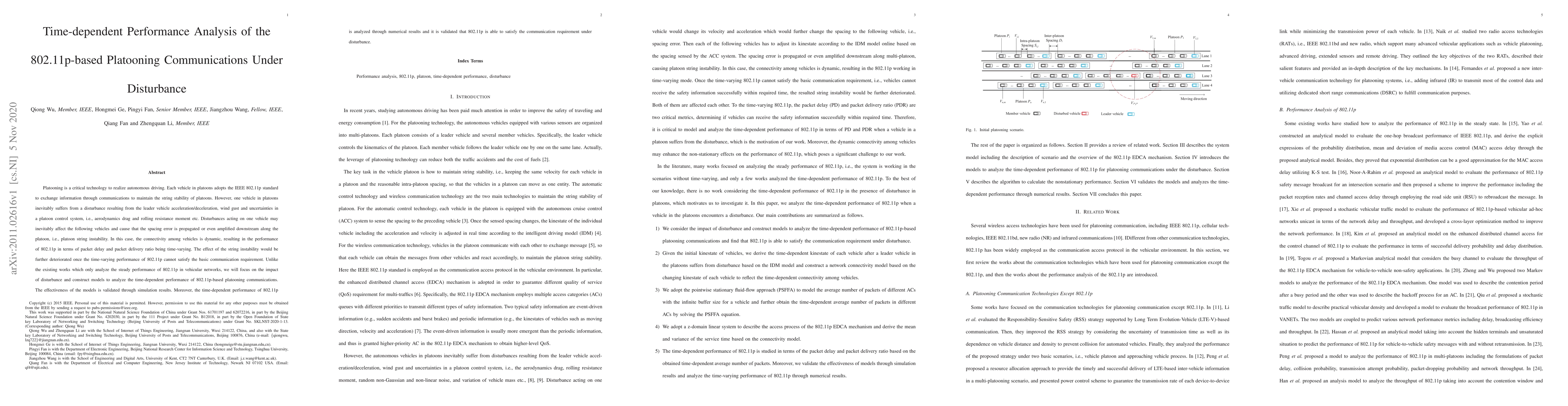 Platooning is a critical technology to realize autonomous driving. Each vehicle in platoons adopts the IEEE 802.11p standard to exchange information through communications to maintain the string stability of platoons. However, one vehicle in platoons inevitably suffers from a disturbance resulting from the leader vehicle acceleration/deceleration, wind gust and uncertainties in a platoon control system, i.e., aerodynamics drag and rolling resistance moment etc. Disturbances acting on one vehicle may inevitably affect the following vehicles and cause that the spacing error is propagated or even amplified downstream along the platoon, i.e., platoon string instability. In this case, the connectivity among vehicles is dynamic, resulting in the performance of 802.11p in terms of packet delay and packet delivery ratio being time-varying. The effect of the string instability would be further deteriorated once the time-varying performance of 802.11p cannot satisfy the basic communication requirement. Unlike the existing works which only analyze the steady performance of 802.11p in vehicular networks, we will focus on the impact of disturbance and construct models to analyze the time-dependent performance of 802.11p-based platooning communications. The effectiveness of the models is validated through simulation results. Moreover, the time-dependent performance of 802.11p is analyzed through numerical results and it is validated that 802.11p is able to satisfy the communication requirement under disturbance.
