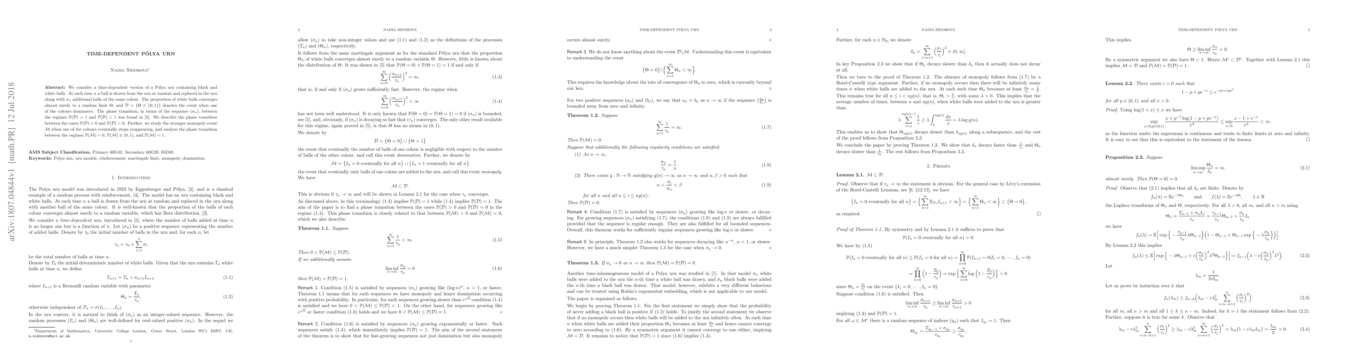 This paper examines a time-dependent Polya urn model where additional balls of the same color are added after each draw, focusing on the proportion of white balls converging to a random limit. It investigates the phase transition dynamics between color dominance regimes and the stronger monopoly event where one color eventually ceases to reappear.