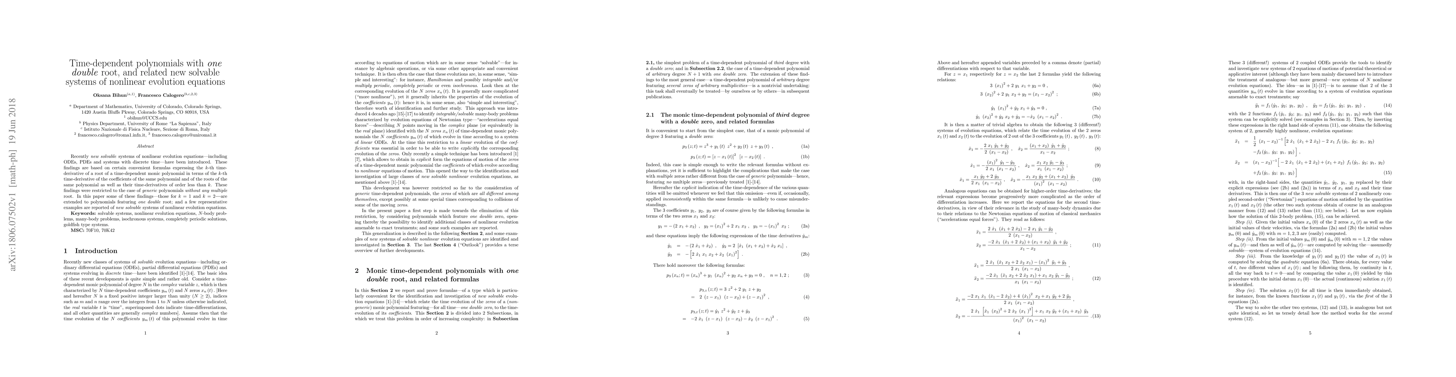 Recently new solvable systems of nonlinear evolution equations -- including ODEs, PDEs and systems with discrete time -- have been introduced. These findings are based on certain convenient formulas expressing the $k$-th time-derivative of a root of a time-dependent monic polynomial in terms of the $k$-th time-derivative of the coefficients of the same polynomial and of the roots of the same polynomial as well as their time-derivatives of order less than $k$. These findings were restricted to the case of generic polynomials without any multiple root. In this paper some of these findings -- those for $k=1$ and $k=2$ -- are extended to polynomials featuring one double root; and a few representative examples are reported of new solvable systems of nonlinear evolution equations.