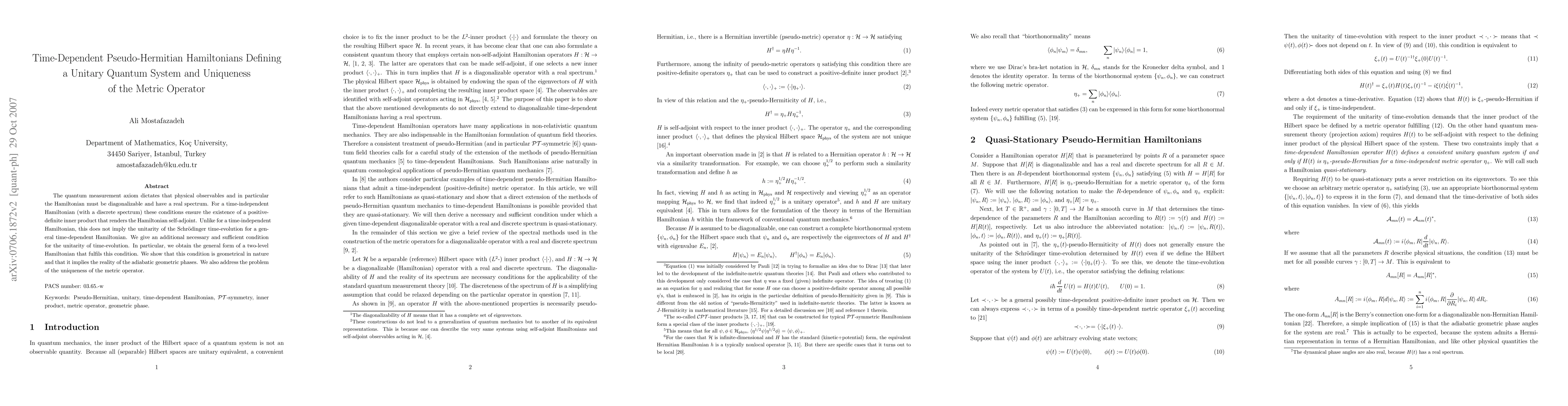 The quantum measurement axiom dictates that physical observables and in particular the Hamiltonian must be diagonalizable and have a real spectrum. For a time-independent Hamiltonian (with a discrete spectrum) these conditions ensure the existence of a positive-definite inner product that renders the Hamiltonian self-adjoint. Unlike for a time-independent Hamiltonian, this does not imply the unitarity of the Schroedinger time-evolution for a general time-dependent Hamiltonian. We give an additional necessary and sufficient condition for the unitarity of time-evolution. In particular, we obtain the general form of a two-level Hamiltonian that fulfils this condition. We show that this condition is geometrical in nature and that it implies the reality of the adiabatic geometric phases. We also address the problem of the uniqueness of the metric operator.