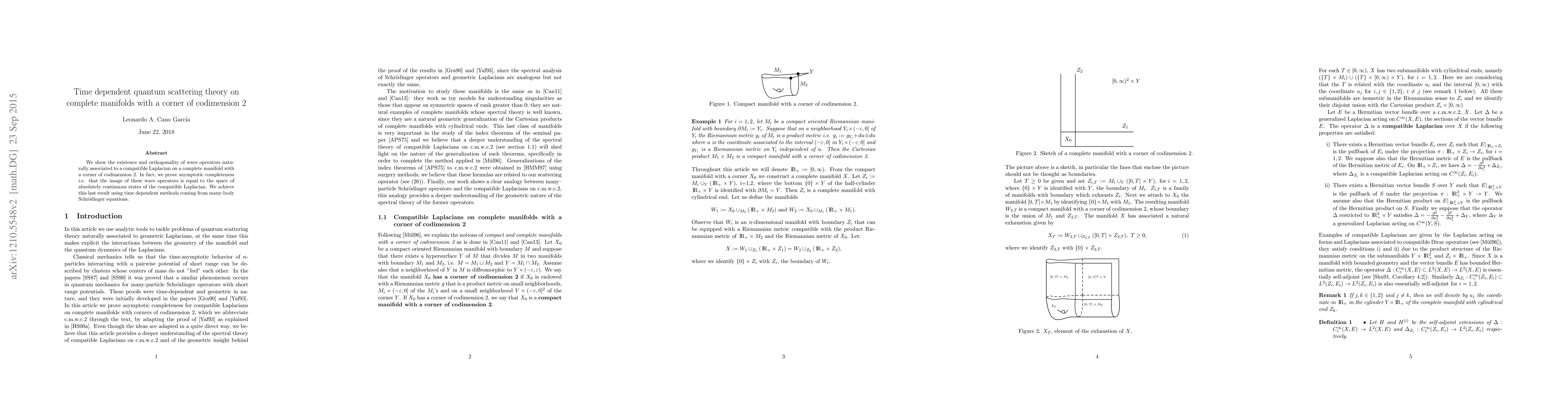 This paper proves the existence and orthogonality of wave operators for a Laplacian on a complete manifold with a corner of codimension 2, establishing asymptotic completeness by employing time-dependent techniques from many-body Schrödinger equations.